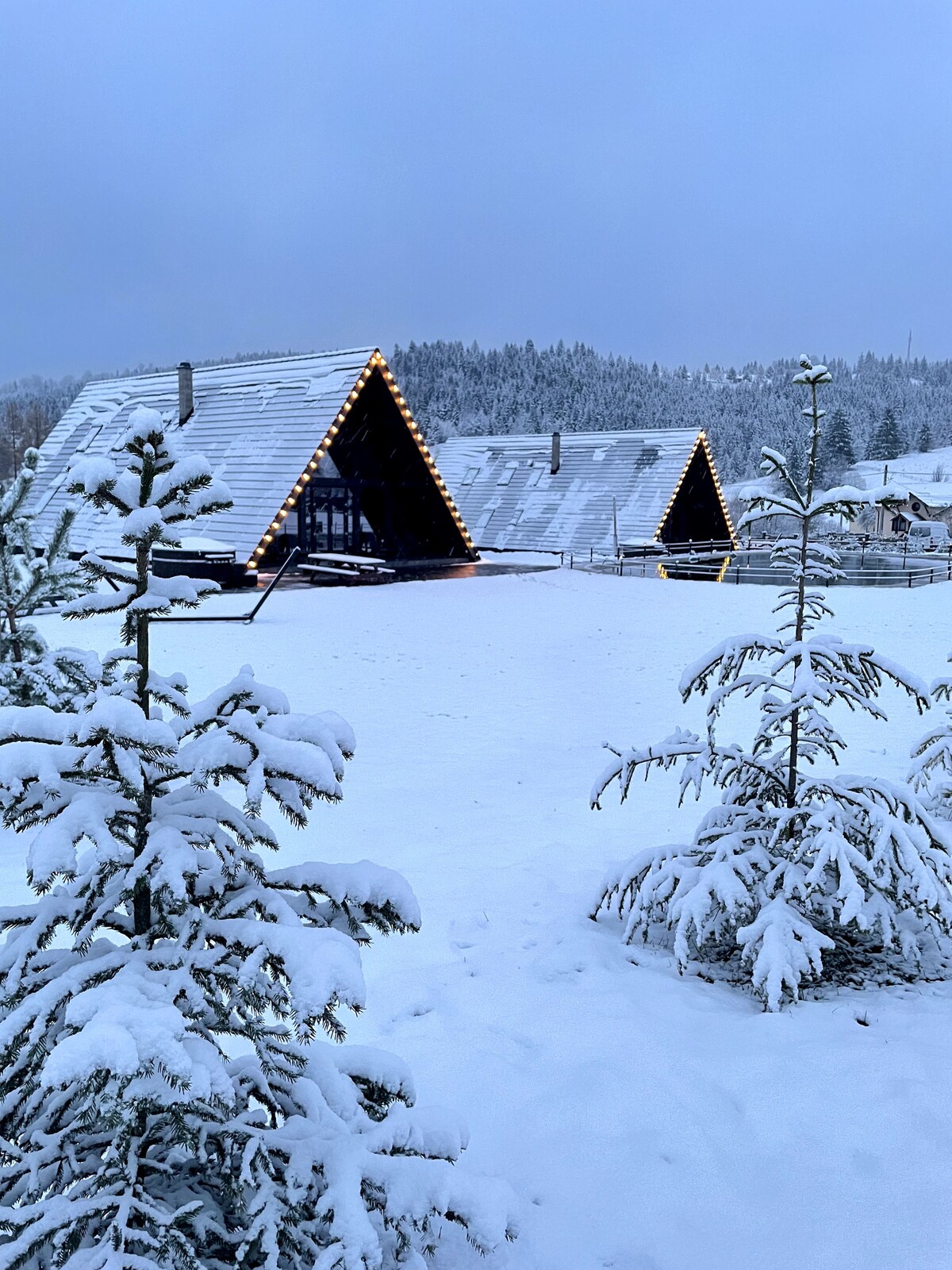 Unique and modern A-frame cabin situated in a quiet and still undiscovered beautiful part of Romania. With a stylish design Treeline Cabins can welcome up to 10 guests having a generous living area, fireplace, beautiful views and a modern outside wooden hot tube to make the cold nights much better.