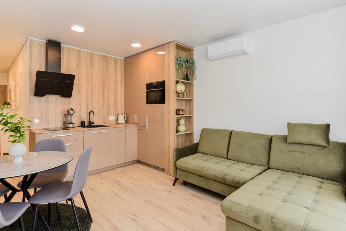 2021-ci ildə terrasla tikilmiş evdə ev kimi mənzil - çimərlikdən yalnız bir addım aralıda yerləşir. Kunigiškiai şəhərindəki qumlu çimərlikdən cəmi 3 dəqiqəlik məsafədə terras və şəxsi parkinqi olan rahat və sakit bir yer. Cütlüklər və kiçik ailələr üçün Litva dəniz kənarını və ya çimərlik kənarında rahat tətil üçün mükəmməl bir yeri kəşf etmək üçün əla seçimdir. Binada yalnız iki mənzil var.