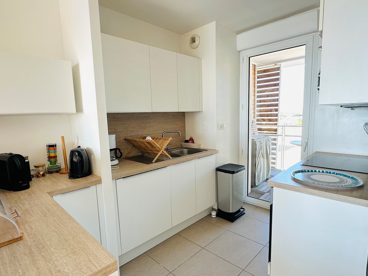 T2 48 m2 + 10m2 terrace (sheltered from wind/rain) on quiet beach on the right bank, on the 1st line. All rooms have sea views. Luxury residence 2015. 2 sheltered/secure parking spaces. Bike storage. Access to the residence is completely secure with videophone, entry code and security guard. Proximity to shops: bakery, butcher, grocery store, tobacco press are 3 minutes' walk away. Port, town center and restaurants are 150-300 m away on foot, along the beach.