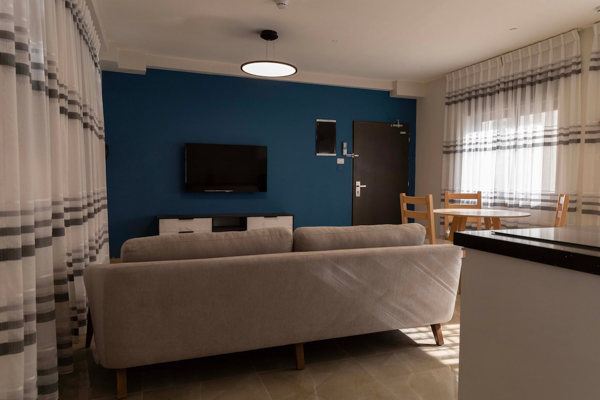 Blue Sand Apartment is a spacious, sunlit home blending deep blue tones with warm sand-colored finishes. A navy feature wall and light flooring create a relaxing coastal-modern feel. The large living space includes a sofa, dining area, and fully equipped kitchen, with windows that fill the room with natural light. The apartment offers two bathrooms and a bright, comfortable bedroom—ideal for families, long-term stays, or guests who enjoy space and simplicity.