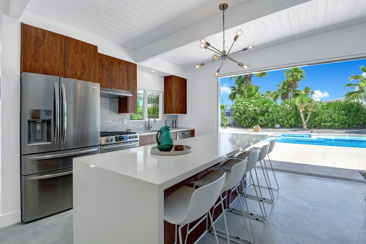 Enjoy a picture-perfect poolside vacation at The 888, a desert oasis with unobstructed mountain views. This historic butterfly roof home was fully upgraded in 2022 to add a stunning outdoor living space with a resort-style pool and spa. It’s the ideal place for a luxurious holiday getaway, just a short drive from local attractions. 4 Min Drive to Downtown 12 Min Drive to Indian Canyons 48 Min Drive to Joshua Tree