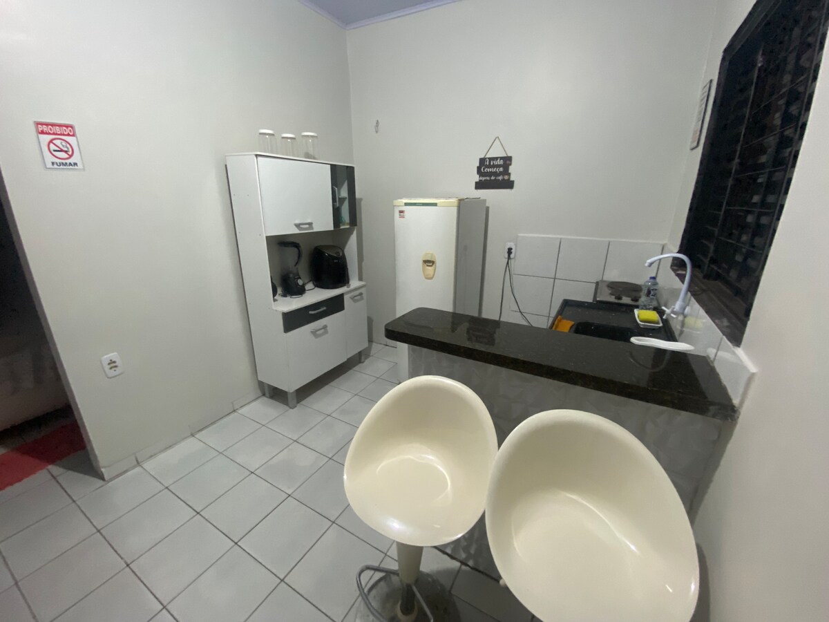 Sua família vai estar perto de tudo ao ficar neste lugar bem-localizado. 2 - Quartos; duas cama casal. 1- banheiro 1- cozinha; contendo uma geladeira, microondas, fogão, bebedouro, cafeteira, mesa, liquidificador e utensílios 1- sala; contendo um Sofa, uma tv, painel parede, Wi-Fi. 1- área de serviço; tanque, varal, ferro e tábua de passar roupas. 1 - um jardim acoplado com quarto No centro de uma palmas