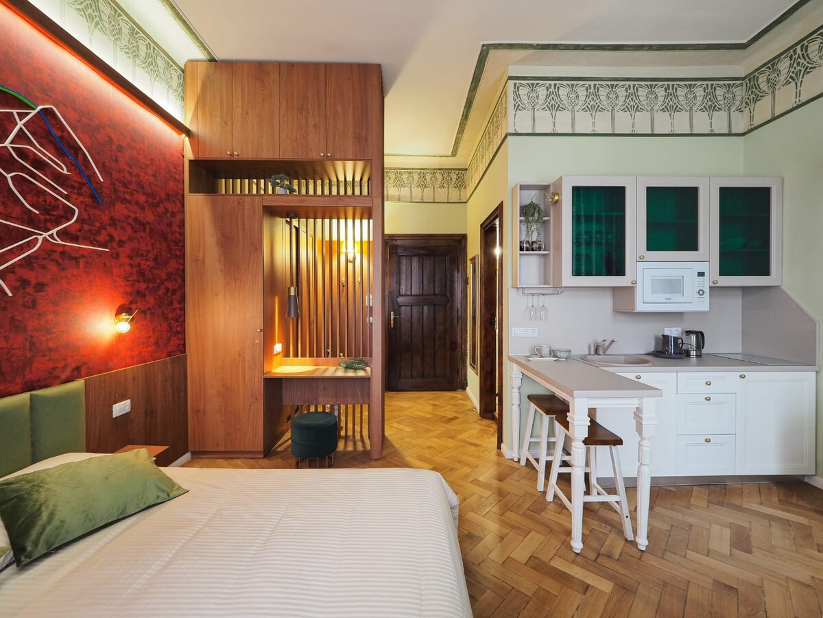 18-ci əsrdən bəri Hermannstadt Gözləri altında yerli tacirlər tərəfindən söylənilən alman nağıllarından ilhamlanan Sakson mühacirlərinin 12-ci əsr mirasından dünyaya gələn Hansel Studio sizə qarşı münasibət ilə eksklüzivlik gətirir. Əlverişli lüks mənzil qonaqlarımızı əsas turistik yerlərin ortasında, orta əsr sitadelimizin mərkəzi ərazisində isti, rahat və müasir atmosferdə dəvət edir.