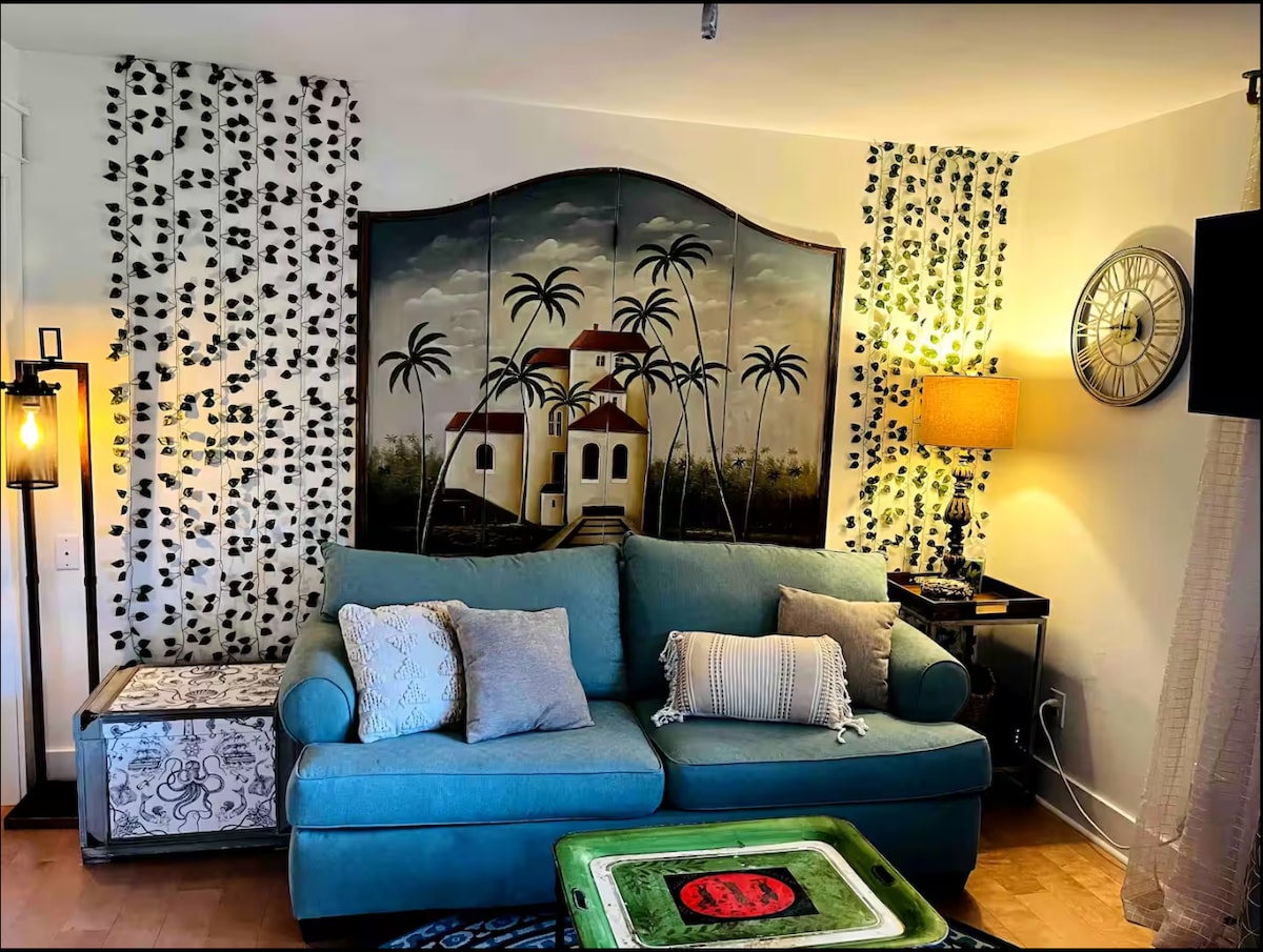 Unwind in our peaceful blue tiny home surrounded by nature. Relax by the propane firepit or enjoy meals at your private picnic table. Inside, rest comfortably with a queen bed, cozy couch, 56" smart TV, heater and A/C. Guests share a fully equipped outdoor kitchen and a bath house with two flush toilets and a hot-water shower. A quiet retreat perfect for recharging and connecting with the outdoors. Relax by the common waterfront area and enjoy complimentary kayaks, canoe, and paddle boat.