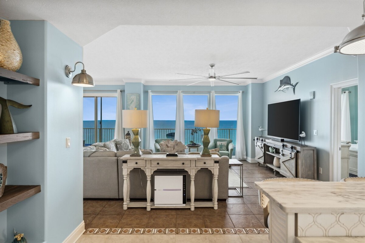 This 270-degree Observatory corner condo on the 25th floor offers breathtaking coastal beache views for miles. Located in the tallest building in PCB, Tidewater Beach Resort, this unique unit allows you to enjoy beautiful sunsets from right from the living room sofa or dinner table. At night, you'll be treated to the dazzling city lights on one side and the enchanting starlight and moonlight over the ocean on the other. The resort boasts several pools, a free spa, a gym, and private beach access