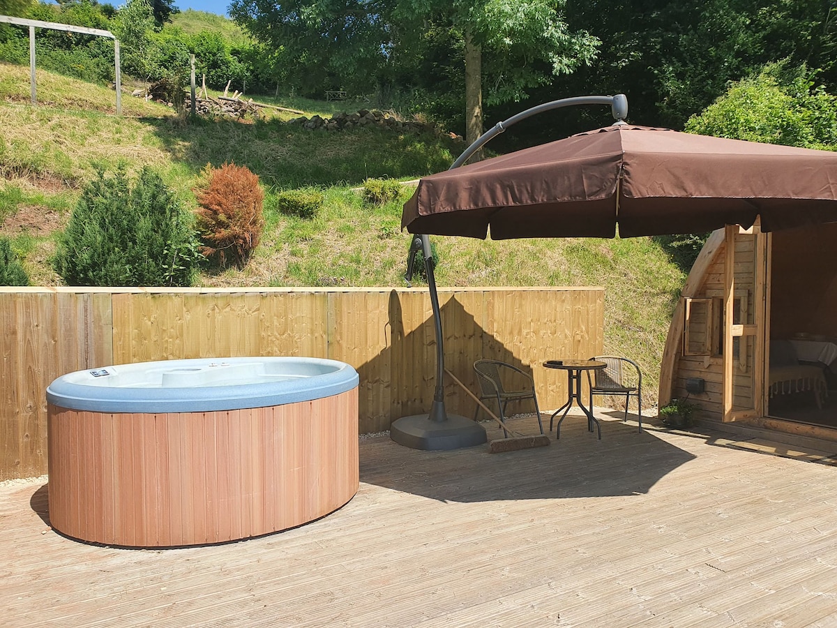 A superb pod, situated in an enviable elevated position with, arguably the most amazing views out across open fields and countryside, situated on the outskirts of the village of Llanymynech on the Powys/Shropshire border. On warmer evenings, guests can enjoy a refreshing drink on the decked area, or relax in the hot tub whilst looking across stunning countryside views.