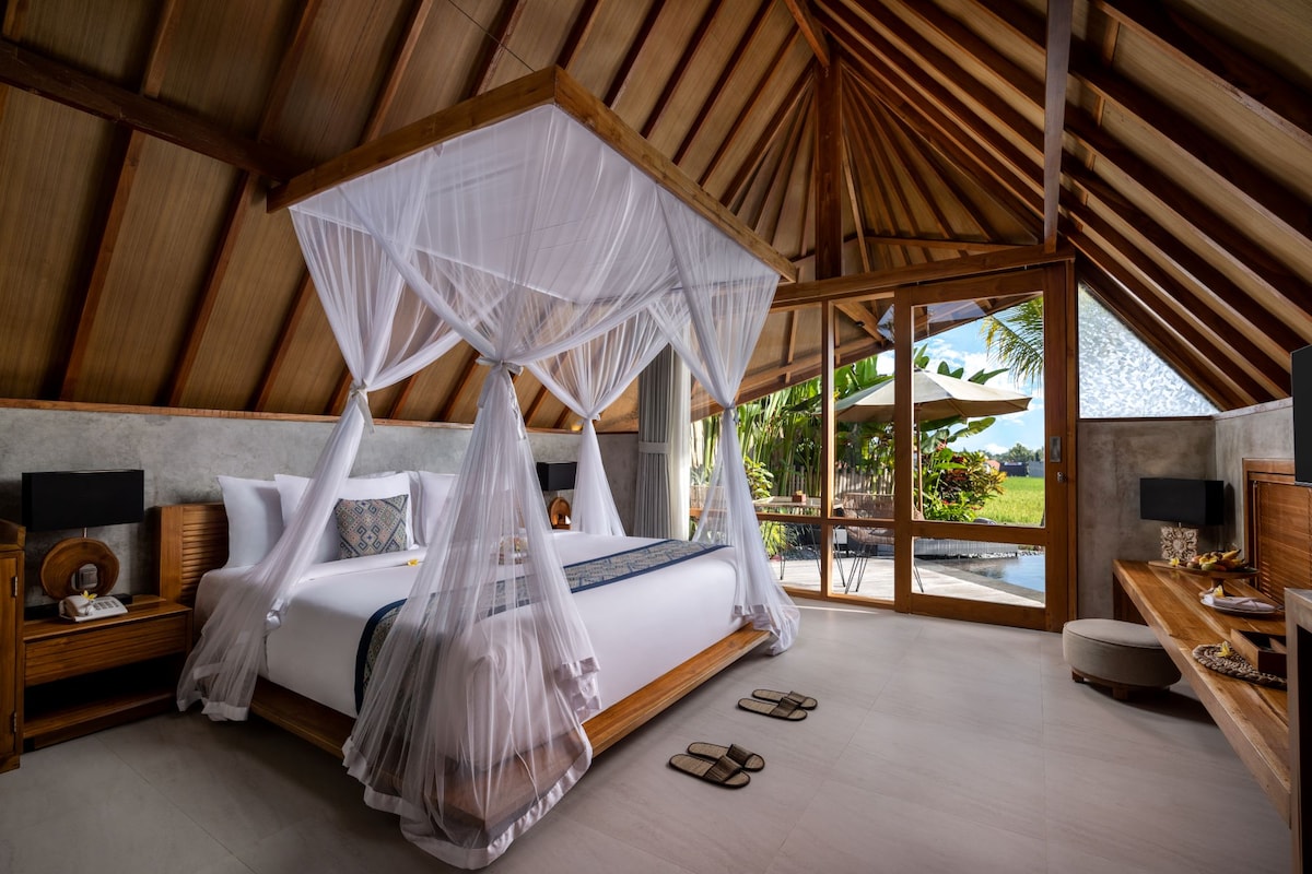 Flood-free area Welcome to Villa Dwipa ☀️ A place where you can indulge yourself in the beauty and luxury of a completely private Bamboo Villa and all it’s facilities surrounded by peaceful nature 🍃 From a dive in the private pool, watching a movie on the drop down cinema screen and having a neighbor-less party in the living room to spending peaceful quality time, cozily unwinding on the balcony and everything in between, whether you're friends or lovers, we guarantee you a good time 😊