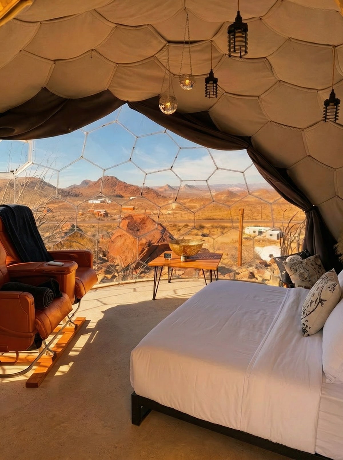 Welcome to the Dome on Javelina Hill, an off-grid glamping experience on 40 wild acres located 15 miles from Big Bend National Park and 12 miles from Terlingua. Hand-built with purpose and soul, this stay is for travelers seeking more than a place to sleep. Off-grid by design, this stay trades modern luxuries for stars, silence, and the raw beauty of the desert. If you’re craving adventure, connection, and the true Big Bend experience, you’ve found it.