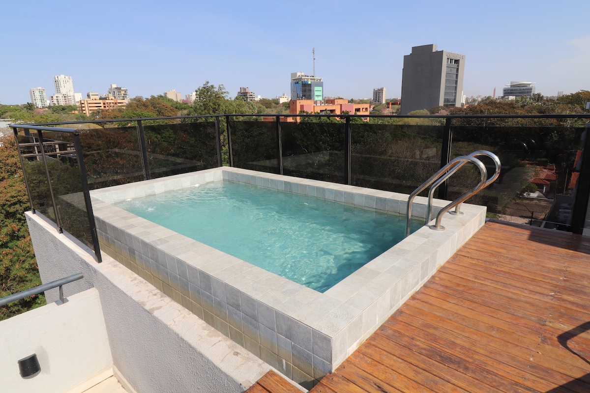 Dəbdəbəli binada yeni mənzil. Özünün 40m² sahəsi var, Smart TV, WIFI və binada bütün imkanlarınız var: Hovuz , manqallı kondisionerli quinço, uşaq oyun zalı, təchiz olunmuş idman zalı və s. Paytaxtın ən dəyərli korporativ mərkəzinə 5 dəqiqəlik məsafədədir və 25 dəqiqəlik məsafədədir. Həmçinin Silvio Pettirossi hava limanına avtomobillə 11 dəqiqədir İkinəfərlik çarpayı + divan-çarpayı var. Cəmi 3 nəfərə qədər yata bilərsiniz.