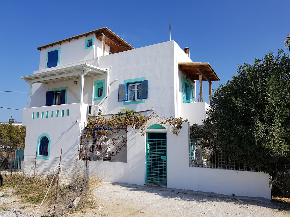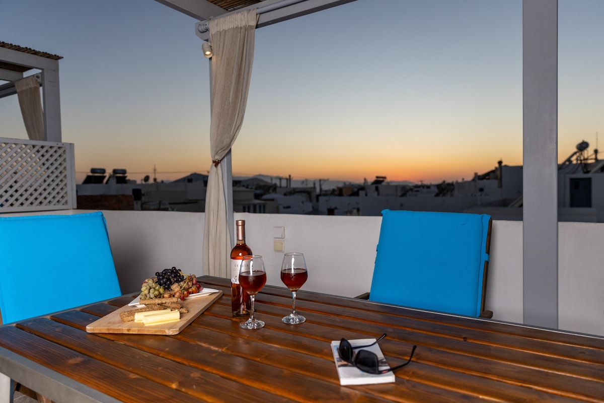 İnkişaf etmiş mühitdə yerləşən, bir yataq otağı və böyük terrası olan, inanılmaz işıqlı və möhtəşəm mənzərələri olan, müasir Kiklad Dizaynlı və Rahat Ev! Ev Naksos şəhərindən 2 km məsafədə, Naksos körfəzinə baxan təpədə yerləşir və heyrətamiz mənzərə təklif edir. Bu rahat ev sizə tətil üçün hər şeyi təklif edir! Ev böyük bir qayanın üzərində tikilib və bağçanız, barbekü olan çox böyük terrasınız, çardaqlarınız, divanlarınız və öz mini hovuzunuz var! Condé Nast Traveller tərəfindən tövsiyə olunur!