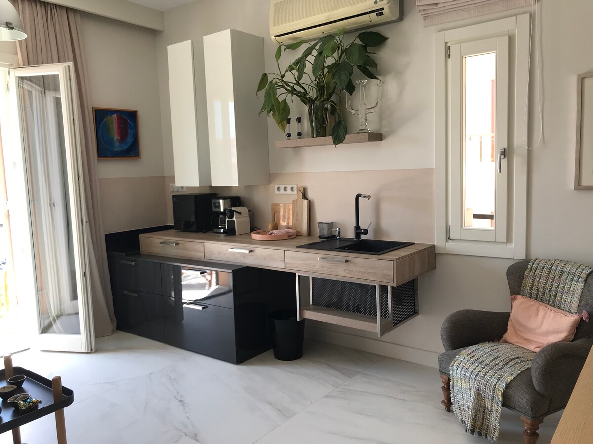 Müasir və sərin mənzil, Xaniyanın mərkəzindən 5 dəqiqəlik piyada məsafədə! Dəniz, San Salvandor qalası, Venesiya divarları və velosiped yolu mənzərəsi. Bir neçə dəqiqəlik piyada məsafədə qonaq Köhnə Limanı, mərkəzi Bazarı, Nea Xora çimərliyini və mərkəzi avtobus stansiyasını (KTEL) görə bilər. Uşaqlı ailələr üçün ideal yer, asanlıqla əlçatan və bütün əsas məişət elektrik cihazları ilə təchiz olunmuşdur.