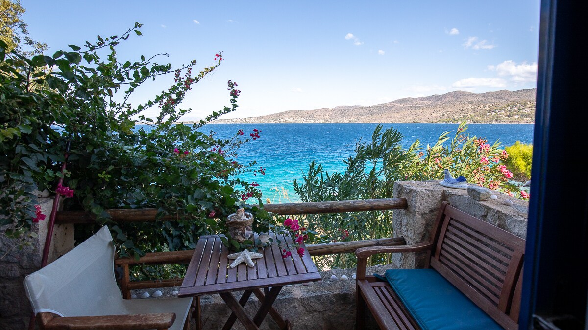Aegina şəhərindən (liman) 30 dəqiqəlik məsafədə, dəniz kənarından 20 m məsafədə 30 kv. m məsafədə rahat studiya. Burada ikinəfərlik çarpayısı olan böyük otaq, soyuducusu olan mətbəx və kiçik stovetop (soba yoxdur) və müasir hamam otağı var. Kondisioner, geotermal soyutma. Ayrılmış evin yüksək zirzəmisindən ibarət olan studiyanın müstəqil girişi, yerdən 8 addım aşağıda, arxa həyətdə Aigina materikinə açılan mənzərəsi var. Ön həyətdəki hovuz qonaqlar üçün mövcud deyil.