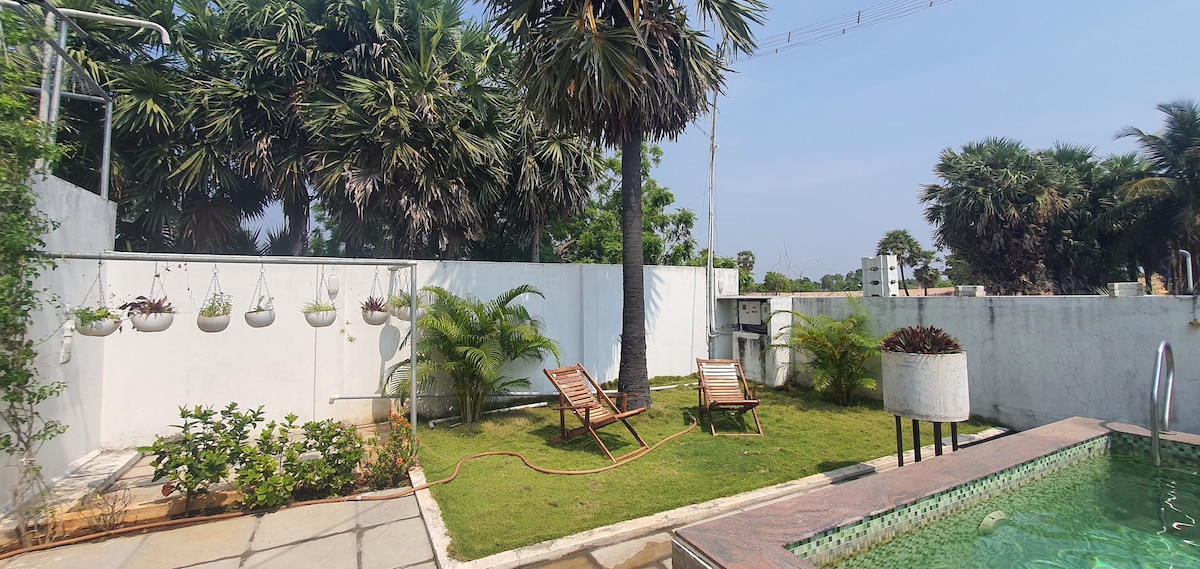 Private beach house with swimming pool surrounded by Back waters, Beach, historic Alamparai 17h century fort and Kadapakkam light house. Indulge yourself in rustic country life and unwind to the sound of crushing waves. Own your privacy as couple or as a friends group. Edaikazhinadu referred as "LITTLE KERELA" 40 mints drive to Pondicherry.