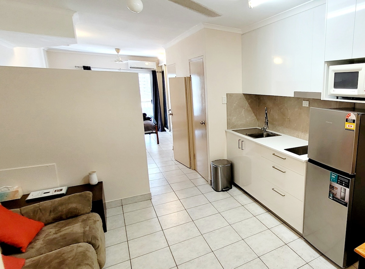 Studio apartment entirely to yourself, free secure off street carpark, fully furnished, queen bed and sofa bed for young children only, infant portacot, brand new kitchen and vanity with stone tops, fresh paint, spa bath, separate toilet, washing machine, dryer, 1 x 40in, 1 x 32in HD flat screen TVs, DVD player, Free Foxtel, Netflix and free WIFI, self-contained with stovetop, microwave, slow cooker, rice cooker and 303L fridge/ freezer, right in the heart of Darwin City, 100m from Smith St Mall