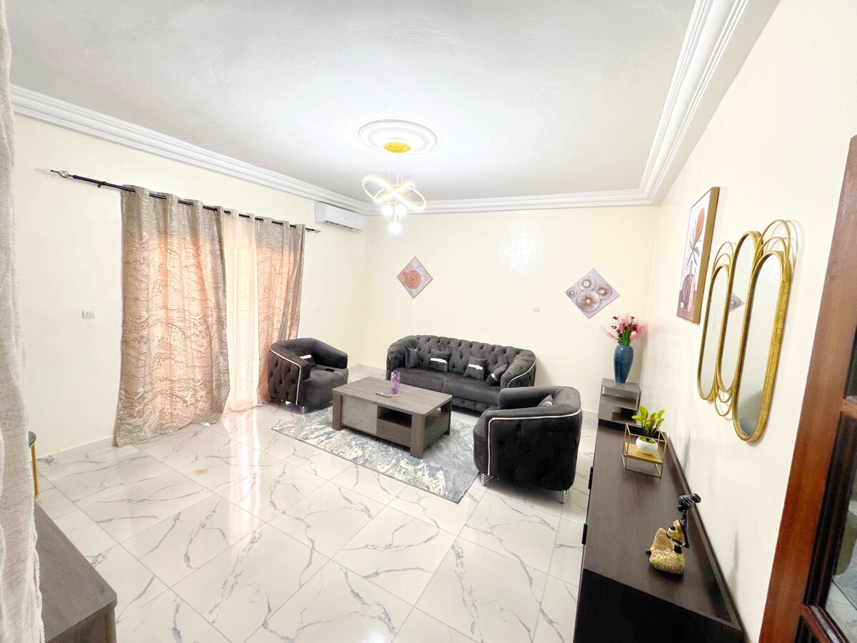 Appartement moderne et confortable, situé au rez-de-chaussée avec entrée privée, idéal pour un séjour serein à Dakar. Il comprend 2 chambres spacieuses, 2 toilettes avec chauffe-eau, et un salon équipé d’une Smart TV avec Netflix et IPTV. L’ensemble est climatisé et dispose du Wi-Fi. L’appartement bénéficie de deux terrasses (avant et arrière) et d’une cuisine fonctionnelle pour un séjour en toute autonomie. L’électricité est à la charge des voyageurs via Woyofal, selon la consommation.