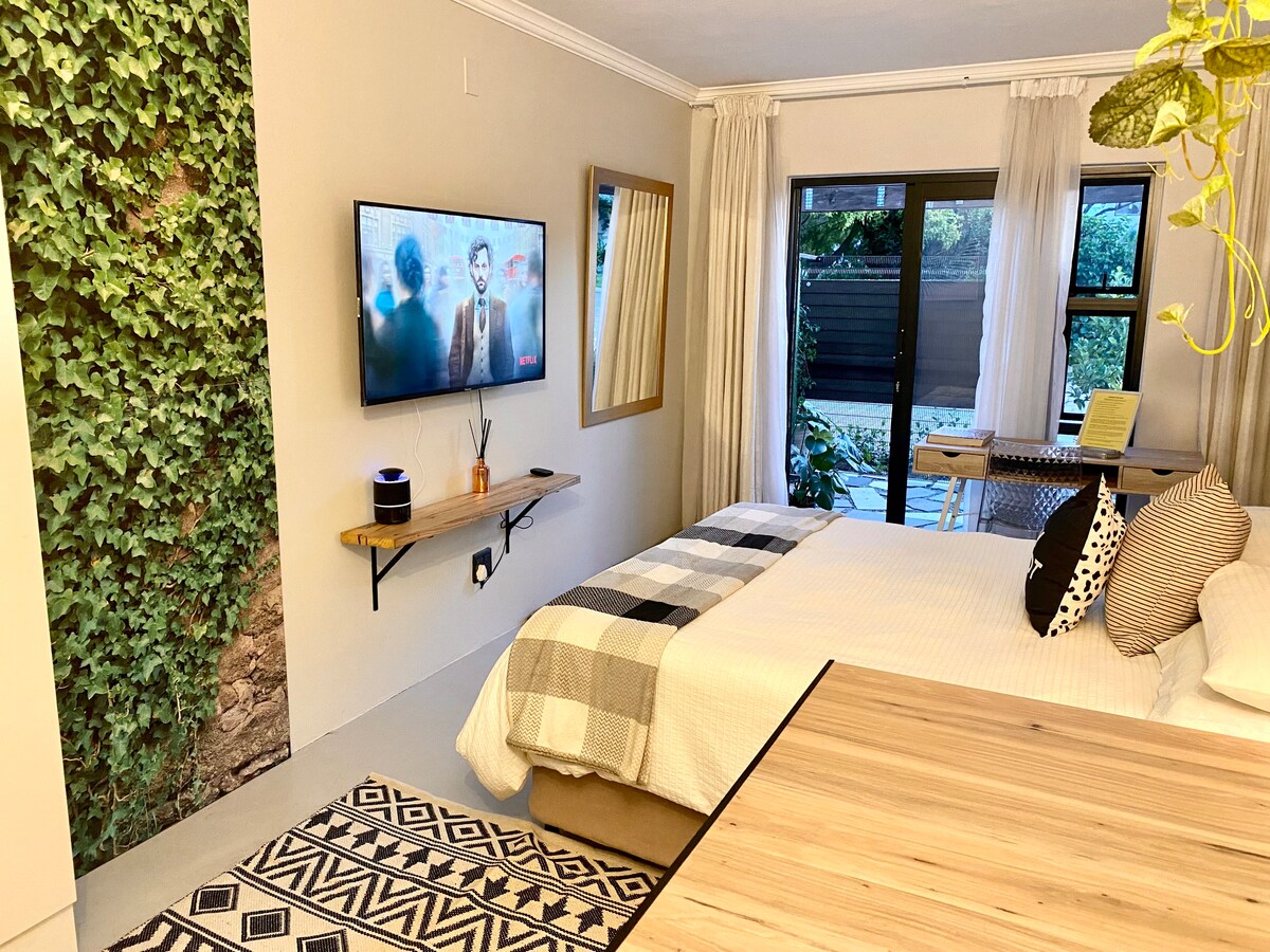 Lovely, modern cottage in Parkhurst has 1 queen bedroom w/ bathroom, mini kitchenette, lounge area, outside sitting area & work from home space. The cottage has a separate entrance. Parking is available by prior arrangement. Main house is occupied during the day Monday-Friday as an office The property has a backup on fibre line & wifi for loadshedding. Parkhurst is central & close to restaurants, shops, shopping malls, parks etc. 10 minutes from the Gautrain. Perfect for long & short stays