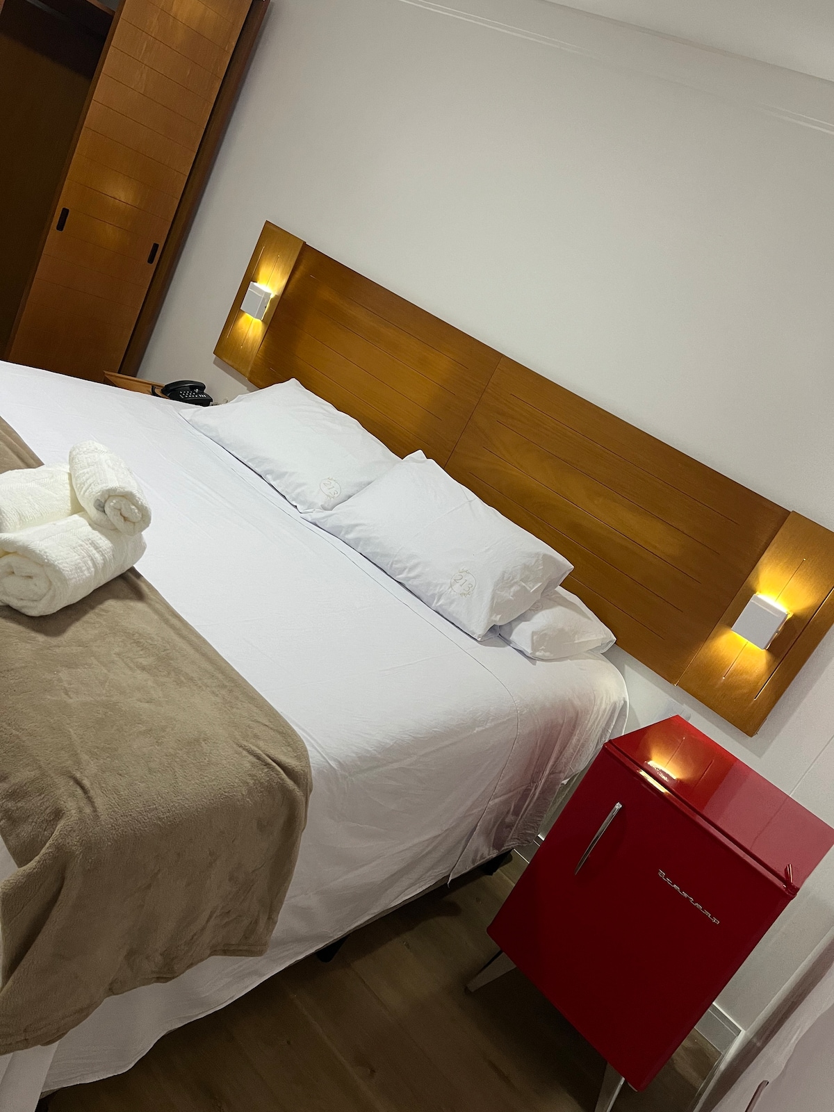 Quarto Triplo confortável e completo, perfeito para famílias, amigos ou viagens a trabalho! O espaço conta com 1 cama King e 1 cama de solteiro, acomodando confortavelmente até três pessoas. O ambiente possui ar-condicionado, Wi-Fi gratuito,TV, além de um espaço dedicado para trabalho. Tem localização privilegiada e bem localizada, fica próximo à praia, restaurantes e comércios. Conforto, praticidade e ótima localização em um só lugar. Reserve já e aproveite uma estadia inesquecível!