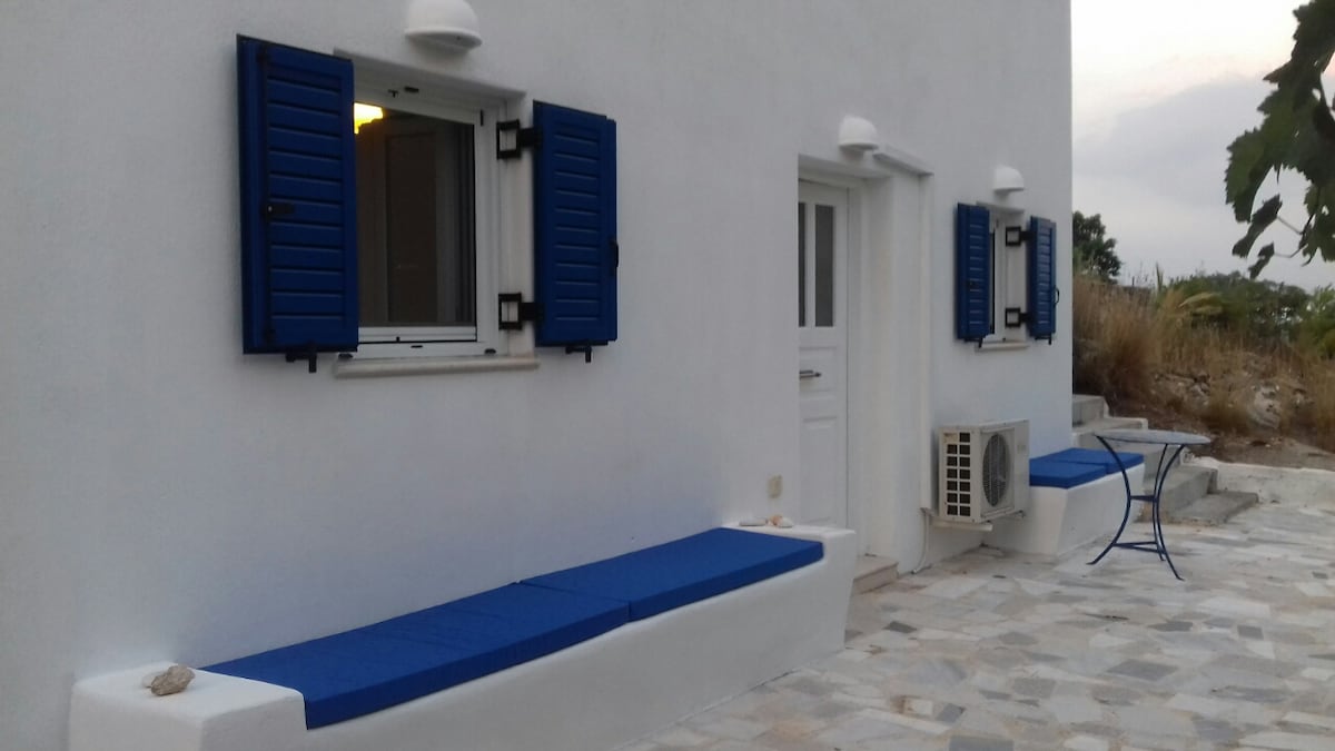 You can enjoy a side sea view and as you can see in the photos it is 15 steps from the sea. 10 meters away there is Sun Kyma café- bar-restaurant, where you can enjoy your meal you want during the day cocktails or breakfast . Next to the rooms you will find FLISVOS watersports club as well as a lovely sandy beach with sunbeds. You will find my place 10-15 minutes walking from the center of Naxos town (Chora) , 10 minutes by car from the port of Chora and 30-40 minutes walking with luggage.