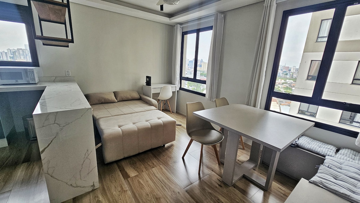 Curta uma experiência acolhedora em uma acomodação contemporânea - ambiente moderno e aconchegante, bem localizada e totalmente equipada ( ar condicionado e TV 65 ”) Você estará perto de tudo ( shoppings, estação de trem a poucos metros , fácil acesso às principais Rodovias ). O espaço conta com Wi-Fi rápido, cozinha completa ( Airfryer, Nespresso, sanduicheira , microondas entre outros ) e uma cama Queen super confortável — tudo para uma estadia perfeita.
