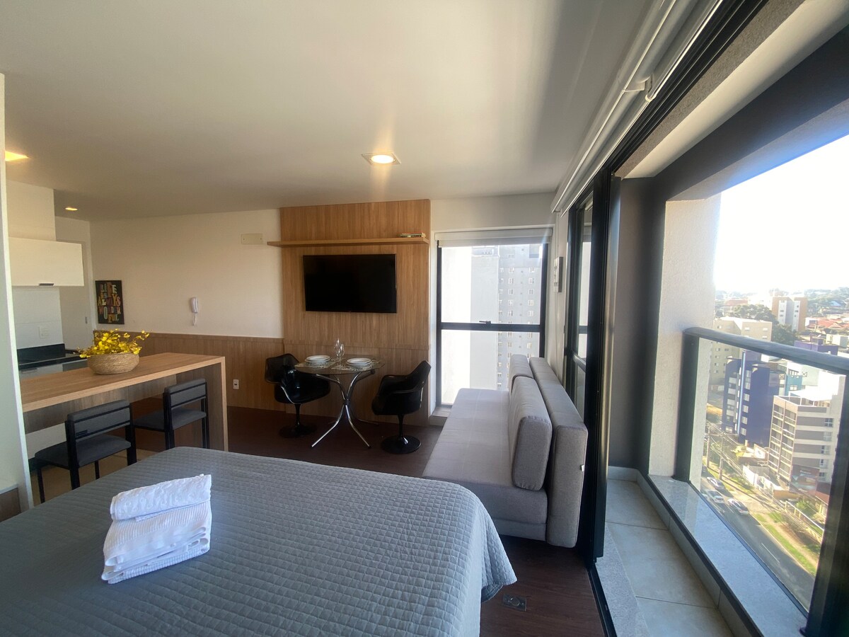 Studio moderno, novíssimo, aconchegante, perfeita localização, com uma linda vista da sacada, principalmente a noite . Wi-Fi rápido, mesa de trabalho, TV smart 55” , cama Queen. Ar condicionado (quente/frio). Máquina de lavar e secar roupa e uma linda ilha na cozinha. 50m2 de muito estilo-27ºandar, Silencioso. No Centro/Batel, próximo à comércios, bancos, shoppings, polo gastronômico e Hospital . No prédio :Piscina, academia, sala de jogos, sauna, jacuzzi, portaria 24 horas.