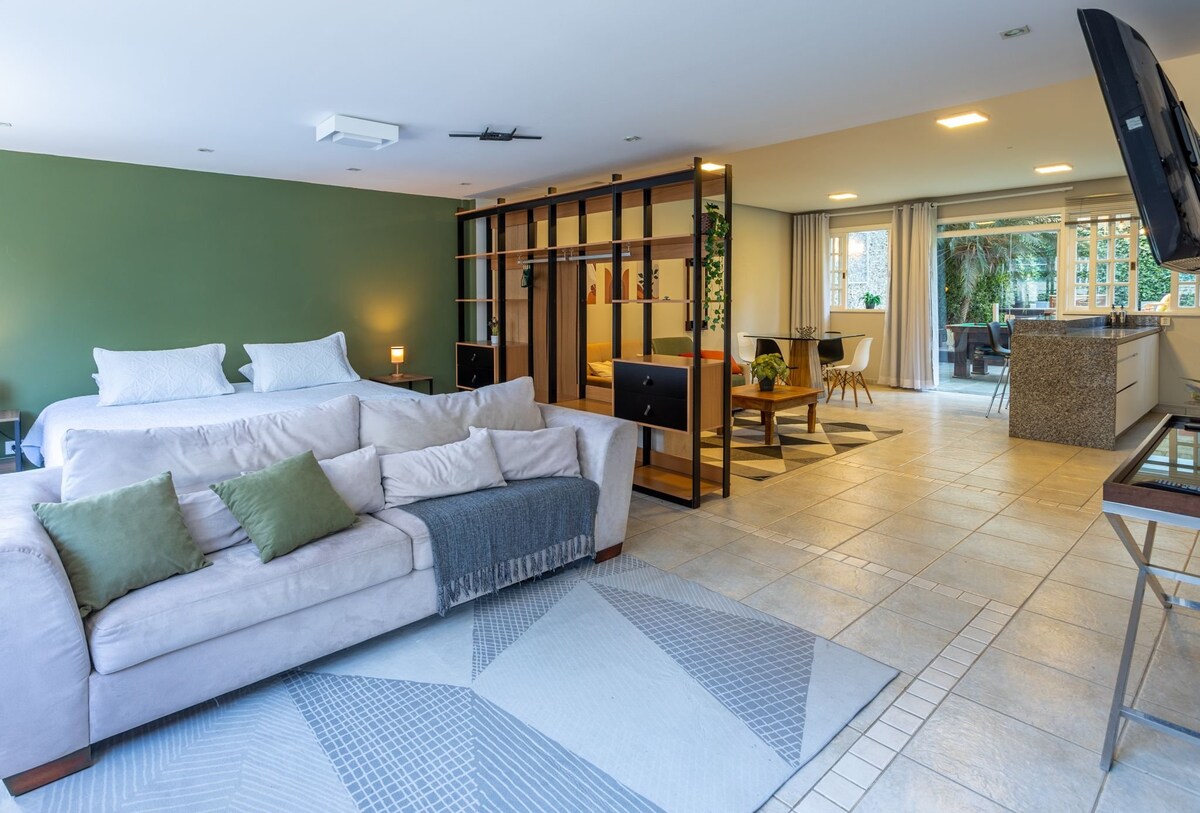Studio no coração do Champagnat pertinho do Parque Barigui. Décor inspirada nos melhores hotéis boutique do mundo. Novíssimo, equipado com eletros e utensílios,airfryer,lavadora samsung, completo para curtas ou longas estadias. Foco em bem-estar: de noites reparadoras em colchão premium com roupas de cama de altíssima qualidade ao sol das manhãs na varanda com churrrasqueira. piscina aquecida, SPA, jacuzzi,academia, lavanderia, e portaria 24h. Ar-condicionado, WI-FI ultra-rápido, Smart TV