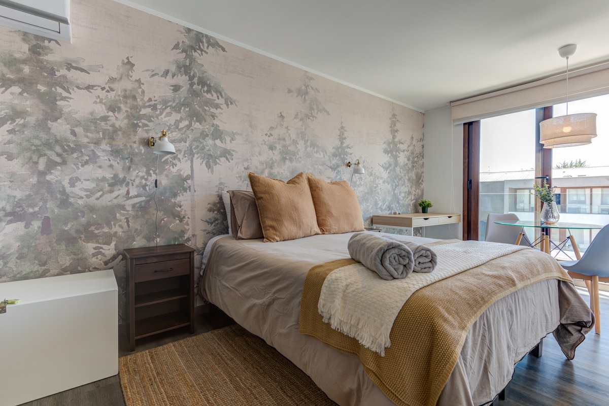 Tarix və mədəniyyətlə dolu bir məhəllədə yerləşən Kvinta Normal Parkının əsas mənzərəsi olan bu rahat studiya sizə layiq olduğunuz qalanı təmin etmək üçün müasir dizayn və funksionallığı özündə birləşdirir. Muzeyləri araşdırın, Matukana 100-də incəsənətdən zövq alın və ya Yunqay Məhəlləsində gəzin. Günün sonunda terrasa qalxın və şəhərin sizə gözəl bir qürub bəxş etməsinə imkan verin Metro Grotto de Lourdes-ə 7 dəq. məsafədə Aeropuertoya 18 dəq. məsafədə ** Əlavə məbləğli parkinq (bron etməzdən əvvəl soruşun)