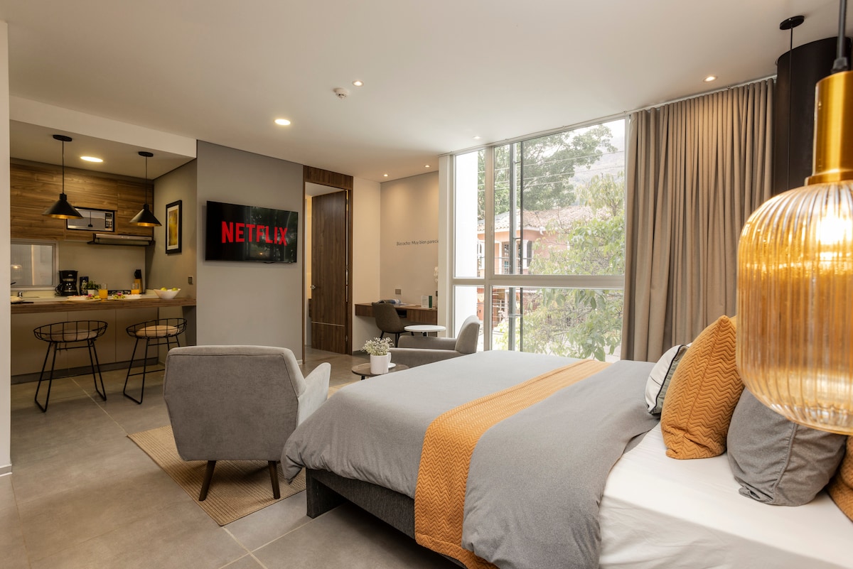 Perú Boutique: Modern Studio in Exclusive North Cali. Is strategically in Santa Mónica neighborhood. This quiet, comfortable, well-equipped, and illuminated space is just minutes away from the vibrant -Zona Rosa- of Granada. It is the ideal place for business trips or tourism, as it features excellent Wi-Fi connectivity. Unbeatable Location: Within walking distance, you will find gyms, a wide variety of restaurants, easy access to public transport, supermarkets, and shopping centers.