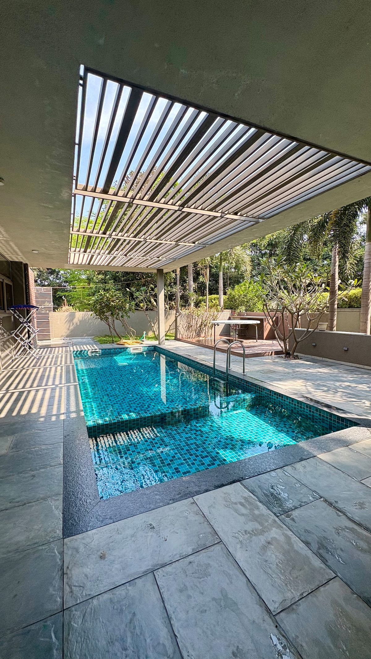 Navsari şəhərindən 10 dəqiqəlik məsafədə, təbii mənzərənin mərkəzində yerləşən Lüks Villa. Həftəsonu dostlarınız və ya ailənizlə birlikdə şənlik (və ya rahat qısa tətil və 5-6 nəfərdən çox olmamaq şərtilə) üçün məkanı mükəmməl edən hovuz və böyük bağ sahələri daxildir. İnkişaf etmiş fermanın içindəki villa və bir araya gəlmək üçün istifadə edilə bilər. Bəli, bütün villa veriləcək. Başqa qonaq yoxdur. Ayrıca hovuz. Ən yaxın restoran 10 dəqiqə olar. Swiggy və Zomato çatdırır. Navsari 'dən 12 dəqiqəlik sürmə məsafəsində.