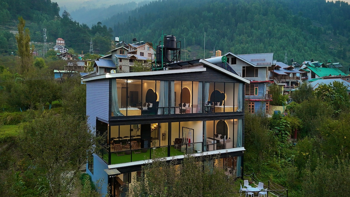 Take it easy at theVasoville Manali | Luxury Glass House Stay near Mall Road (3 km) with Mountain View Boutique Airbnb with 5 rooms including Jacuzzi rooms, AC rooms & balcony view. per Room max 3 guest with extra mattress. Enjoy panoramic Himalayan views, snow-capped mountains, infinity valley view, bonfire lawn, dining area & peaceful location. Ideal for couples, families & groups seeking a luxury homestay in Manali unique and tranquil getaway. 20-30 meter walk to the stay from road in orchid.