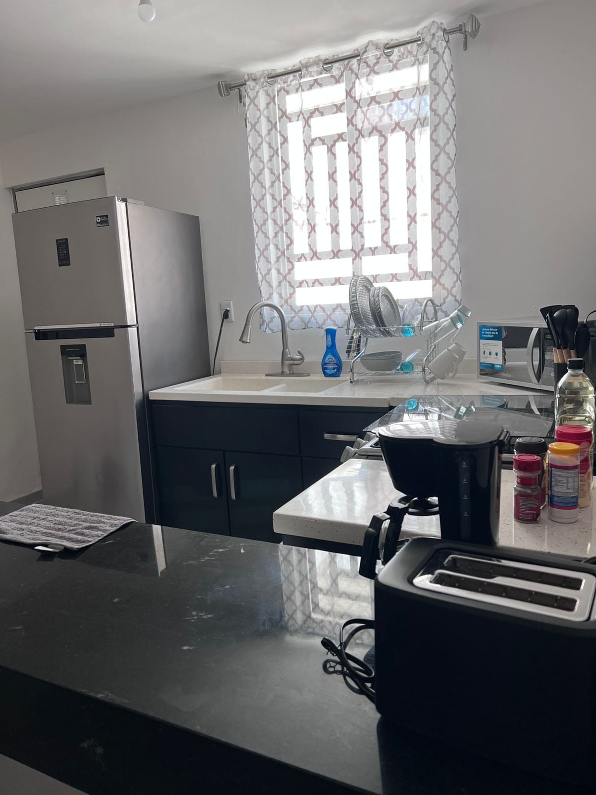 Yenilənmiş mənzil, 2 yataq otağı (hər ikisi bölünmüş), mebelli mətbəx. Paseo La Fe-dən piyada 5 dəqiqədən az, əsas Av. Migel Alemán-dan isə 10 dəqiqədən az məsafədə əla mövqe. Mərkəzdə yerləşən qonaqlama yeri, Walmart-a, sitadel AVM-ə, fastfud və oxxo restoranlarına yaxındır. Mənzildə əsas təmizlik və şəxsi gigiyena elementləri var. Qeyd etmək vacibdir ki, biz 4 mənzildən ibarət kompleksin birinci mərtəbəsində yerləşirik.