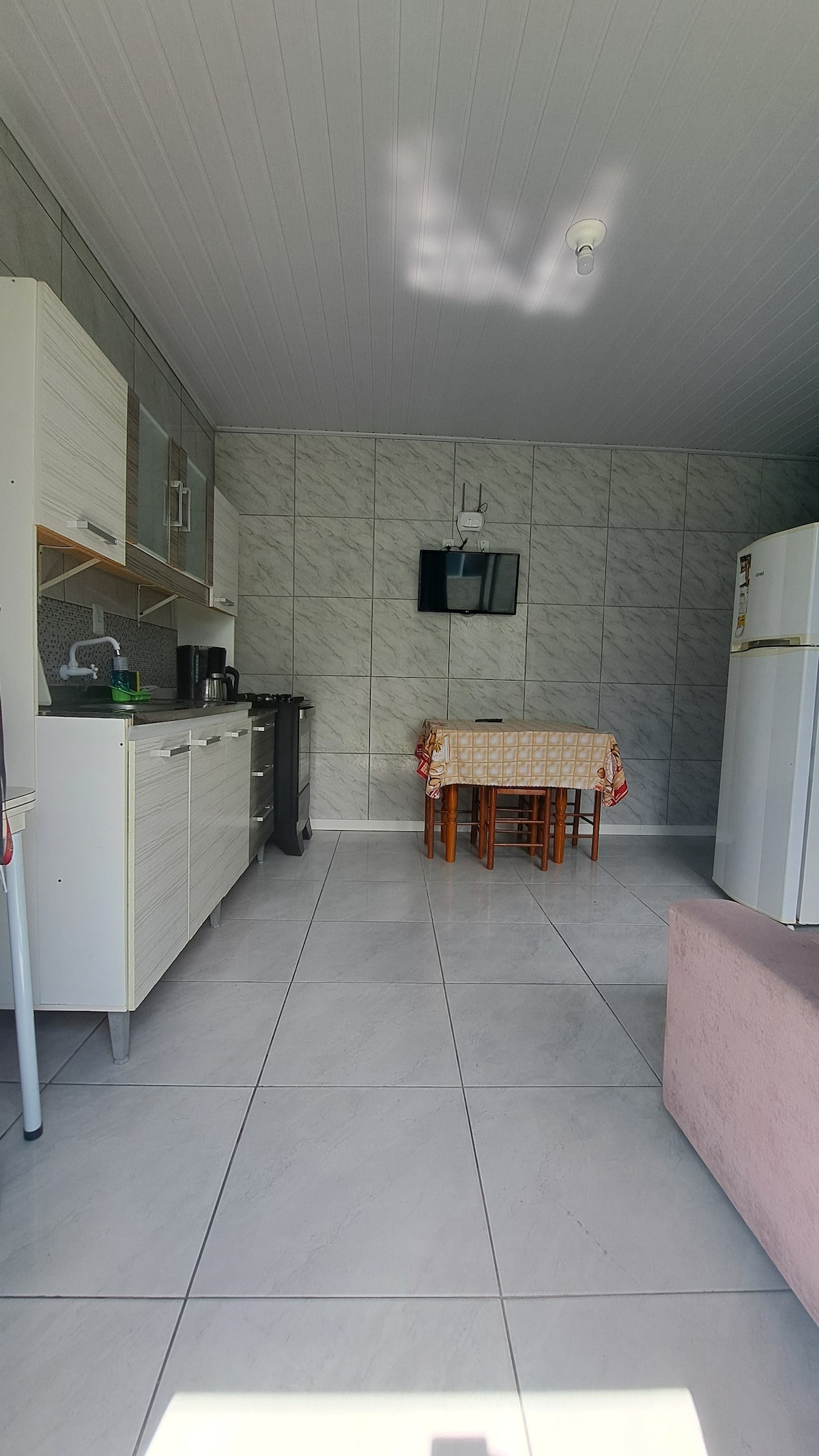 Burada iki nəfərlik çarpayısı olan 1 yataq otağı və yaşayış sahəsindəki menteşəli rəf üzərindəki ikinci açılan çarpayı var. Bu, məkanı rahatlıqla optimallaşdırır. 500 mq Wi-Fi, split kondisioner, barbekü ilə təchiz olunmuş qurmə sahəsi, fırlanan şiş, mikrodalğalı soba, elektrik sobası, sendviç bişirən, elektrikli çaydan, soba və qab-qacaqlar var. 1 ventilyator, uzaqdan iş üçün stul və masa, eləcə də 1 televizor var. Yataq dəsti və ümumi paltaryuyan maşın təklif edirik. Hamam dəsmalları və tualet ləvazimatları təklif etmirik