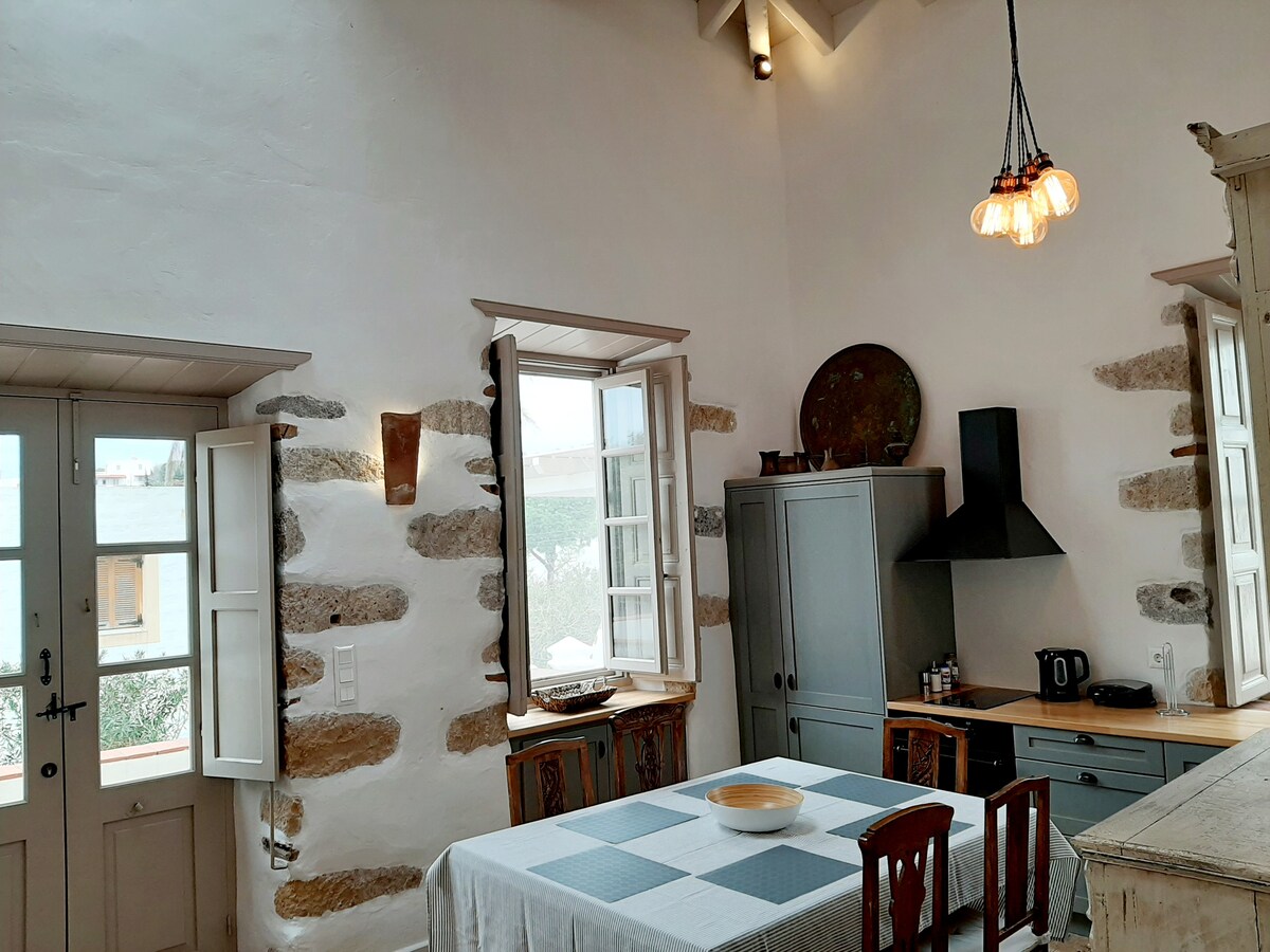 Bu evdə dənizə açılan ən möhtəşəm gün batımlarından biri var. Mövqe Meqali Panagia kilsəsinə bitişik Müqəddəs İohann monastırının demək olar ki, yanında Horanın yuxarısında yerləşir. Orta əsr şəhərinin çox sakit və sakit bir yerində ən müasir standarta uyğun şəkildə inşa edilmişdir. Burada günəşdən qorunan xarici səhər yeməyi üçün gözəl qəlyanaltı və dam terrasından incə mənzərə var. Avqust ayında əsas meydandan üç dəqiqədən az məsafədə olmasına baxmayaraq çox sakit qalır.