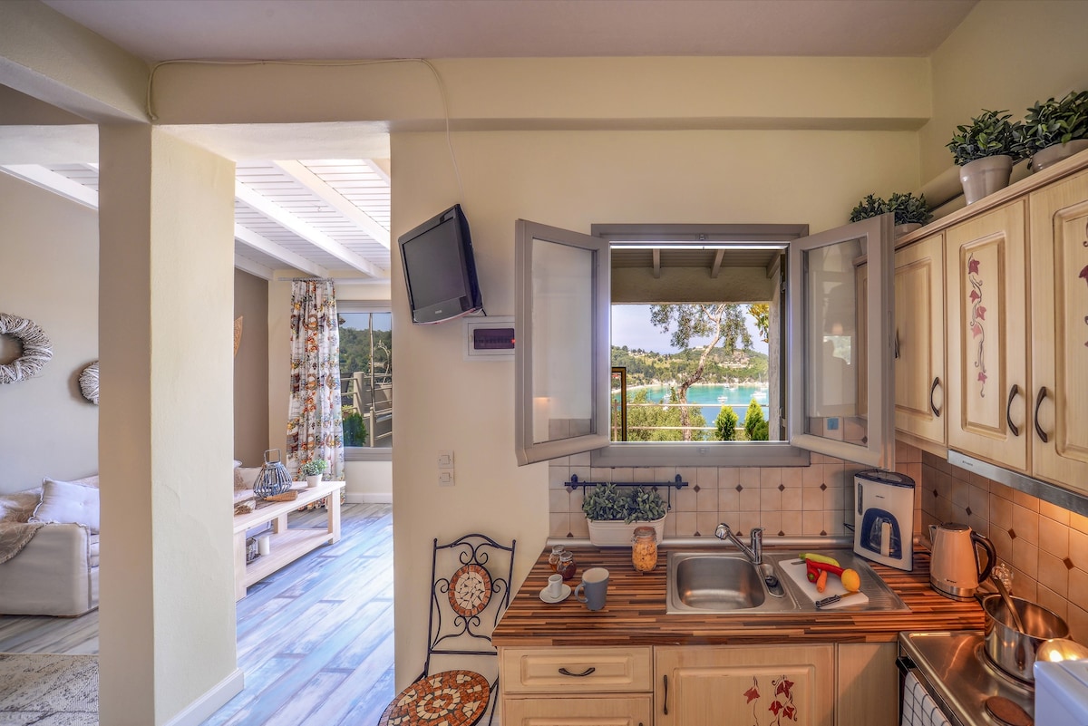 Bu əmlak ikinəfərlik çarpayı və duş kabinəsi olan hamam otağının daxil olduğu studiyadır. Studiyaya tam təchiz olunmuş mətbəxdən ibarət gözəl şərait və bir geniş mühitdə qonaq otağı daxildir. Pəncərələr bağça və Lakka körfəzinin heyrətamiz mənzərəsi ilə üzbəüzdür. Çöldə körfəzin gözəl mənzərəsi və ayrıca cakuzisi olan gözəl terrasımız var. Paylaşılan hovuzdan və müstəsna mənzərələri olan paylaşılan oturma və yemək sahələrindən istifadə edə bilərsiniz.