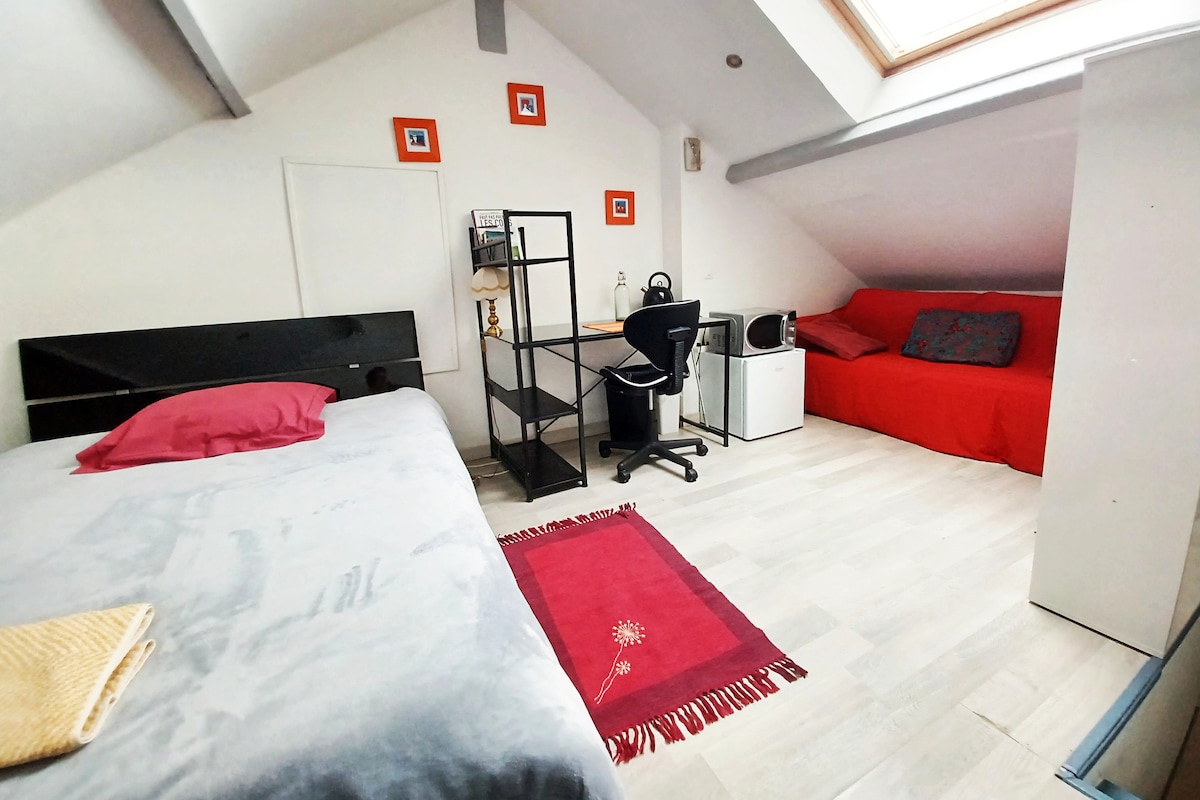 Qonaqlama üçün xoş bir yer (istirahət, peşəkar...), sakit, əsas hissədən tamamilə müstəqildir. 28 kvadratmetr sahədə bunlar var: - yataq sahəsi, masa, divan və televizoru olan qonaq otağı - təchiz olunmuş mətbəx (qəhvə maşını, çaydan, toster və s.) - duş otağı - yemək üçün açıq hava məkanı Şəhər mərkəzinə (20 dəqiqəlik piyada məsafədə) və ya avtobus dayanacağına 5 dəqiqəlik məsafədə, tramvaya 9 dəqiqəlik məsafədə ideal yerləşir, gözəl şəhərimizi kəşf etmək üçün mükəmməl olacaq!