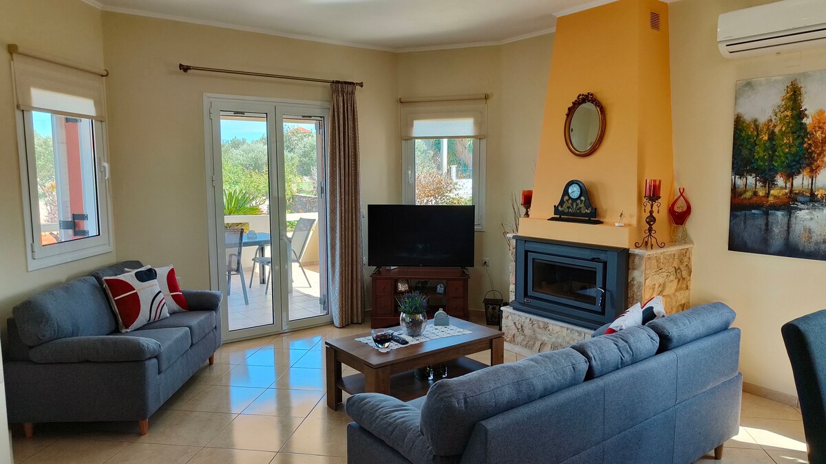 A welcoming and warm place ideal for families & groups of friends. It is an independent house with large porches built on a plot in a safe area. Within the plot there are parking spaces and a large well-kept garden. It is a comfortable and spacious house with 3 bedrooms(1 queen-size bed, 3 single beds and a sofa-bed), 2 bathrooms, an open plan living room, dining room and fully equipped kitchen. The living room/dining room/kitchen have state of the art AC, as well as all of the bedrooms.