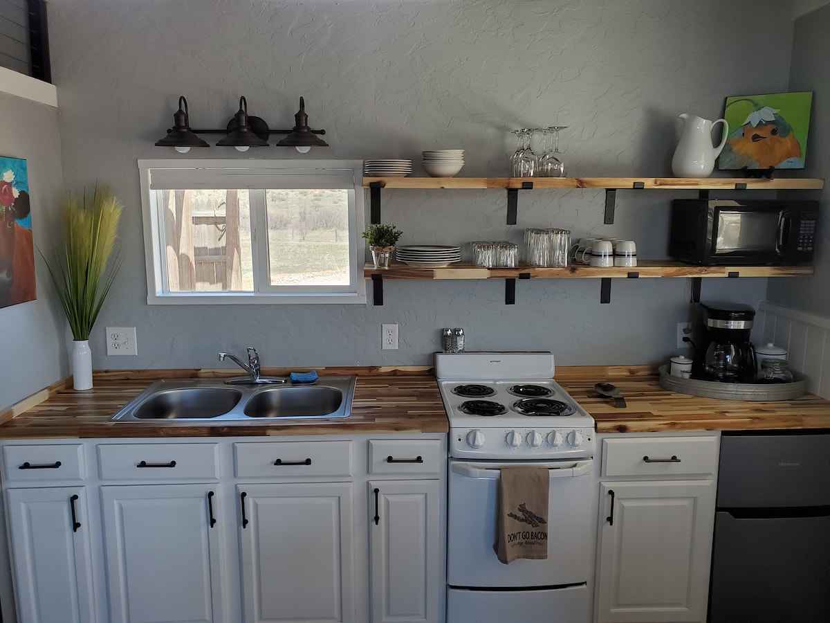 La Cienega Vadisində Santa Fe-dən cəmi on dəqiqə cənubda yerləşən sülh və sakitliyə rahatlıqla ev sahibliyi edin. Bu rahat, rahat, qüsursuz təmiz, bir yataq otağı kasitasından gözəl mənzərələri, geniş gecə səmalarını və möhtəşəm günəş vannalarını təcrübədən keçirin. Səhər qəhvə fincanınızdan zövq almaq üçün qarşısında gözəl bir eyvan var. İki nəfərlik romantik tətil və ya bir nəfər üçün ilıq istirahət olmasından asılı olmayaraq, ovsunlanacağınıza əminsiniz.