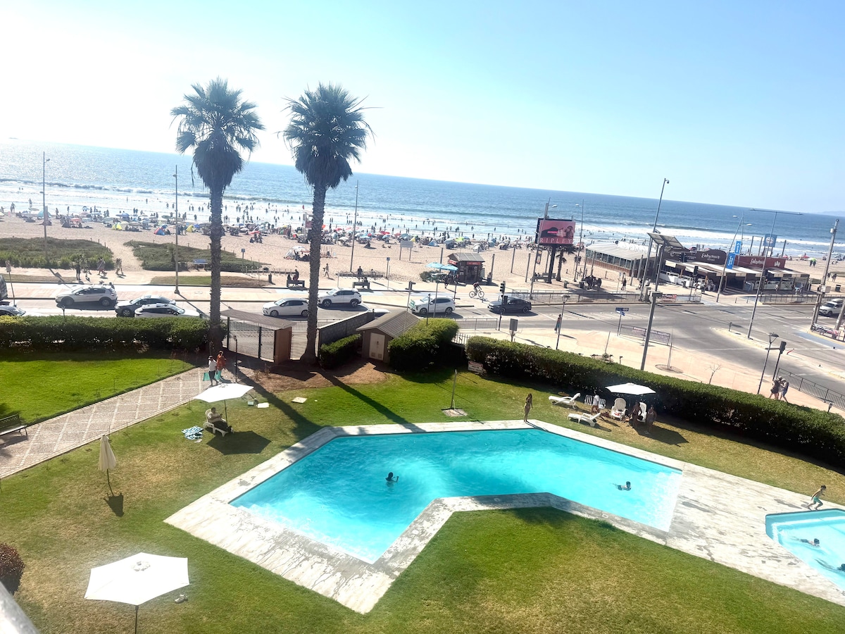 Relájate en este espacio tranquilo y acogedor. Disfruta de increíbles atardeceres y desconéctate de la rutina. El departamento ubicado en el 2do piso está recientemente remodelado, cuenta con vista al mar, completamente equipado y con muy buena ubicación para que tengas una increíble estadía. Cuenta con piscina(exterior de oct a marzo), wifi, tv cable, conserjería 24hrs, toallas, ropa de cama y estacionamiento propio. Restaurant, pub, discotheque, casino a solo pasos del alojamiento.