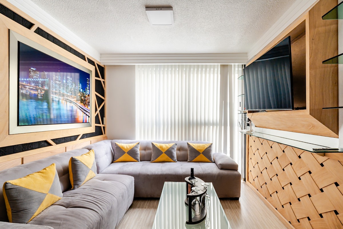 Yeni və tam təchiz olunmuş mənzildə lüks qonaqlamadan zövq alın, mənzil WTC və Pepsi Mərkəzindən 2 blokdan ibarət şəhərin ən təhlükəsiz koloniyalarından birində yerləşir, gözəl meşəlik mənzərəsi, taxta döşəmələri, yüksək sürətli WIFI, 24/7 nəzarət, parkinq, ərazidə əla ünsiyyət marşrutları və xidmətləri olan böyük balkon və böyük pəncərələrlə əhatə olunub, restoran və kafelərlə dolu bir məhəllədir, Park 1,5 blokdan ibarətdir.