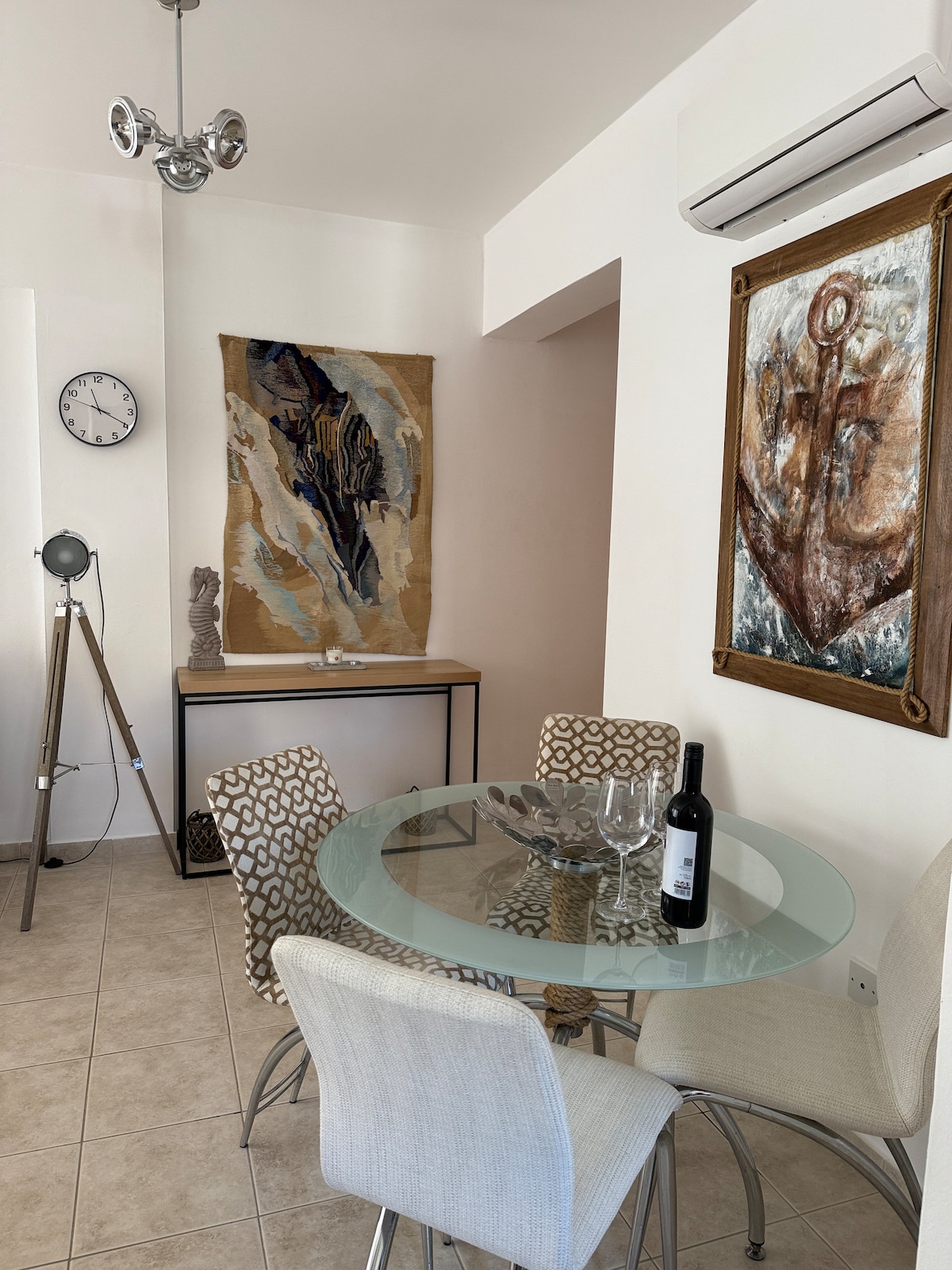 A bright, modern and spacious apartment, fully equipped kitchen, spacious bathroom, plenty of storage, open dining area and separate TV/entertainment room. Rear door opens to outdoor seating for 3 and a newly renovated pool. The bedroom sleeps 2, with optional lounge pull out to sleep 1 adult. Off street parking and outdoor table with seating for 3. Very quiet neighborhood, 5-7mins walk from the heart of Kiti, 10-15mins drive to Larnaca Airport, 5mins drive to local beaches,