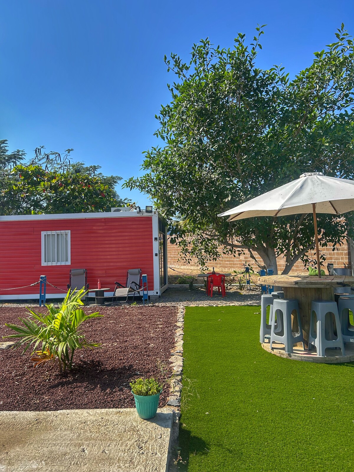 Kasa Terra yük konteynerindən hazırlanır. Burada çarpayısı, kondisioneri, təchiz olunmuş balaca mətbəxi və terrası olan yataq otağı var. Bundan əlavə, məkanınızdan, günəş vannalarından, manqaldan, müxtəlif birgə yaşayış sahələrindən, idman zalından və od çuxurundan bir neçə addım məsafədə üzmək və istirahət etmək üçün Wi-Fi, televizor və 12 metrlik hovuzdan zövq alacaqsınız. Çimərliyə piyada cəmi 12 dəqiqəlik və ya 6 dəqiqəlik məsafədədir. Qonaqlamanız zamanı istifadə etməyiniz üçün velosipedlər götürürük.