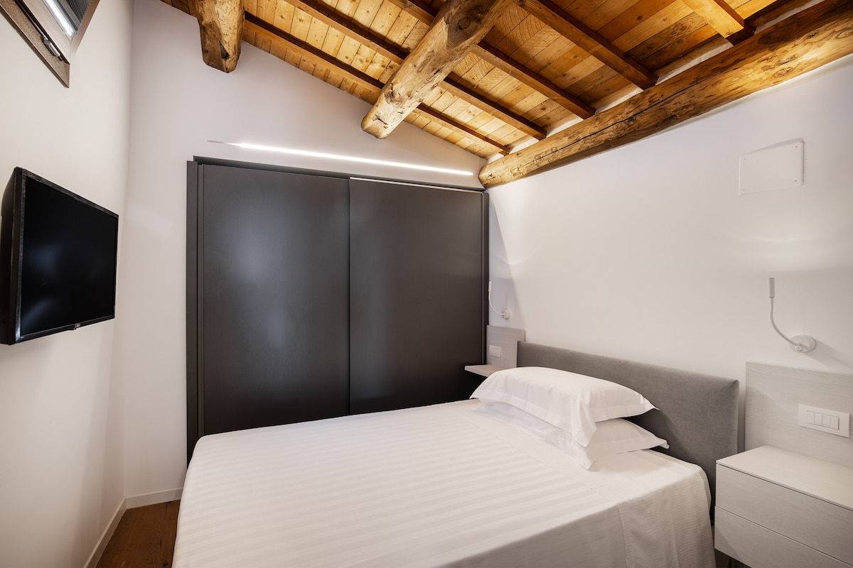 La suite offre un letto matrimoniale e due letti singoli, ospitando comodamente fino a quattro persone. Inoltre, dispone di un bagno in camera per maggiore privacy e comodità.