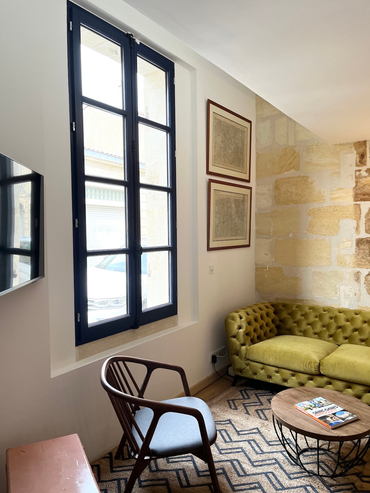 Tarixi mərkəzin mərkəzində yerləşən daş binada sevimli işıqlı ikiotaqlı mənzil. Place de la Bourse və su güzgüsündən 200 m məsafədə, Place du Palais (ChezFred) və Place Saint-Pierre arasındakı kiçik bir xiyabanda çox yaxşı yerləşir. Tramvay dayanacaqlarının yanında! Mérignac Hava Limanına birbaşa tramvay xətti. İsti, rahat, tipik, daş buxarı. Skandinaviya aksentləri ilə yavaş dizayn dekorasiyası. Orqanik aşpazlıq bazası. Yataq çox rahat döşəkağı və quzu yunu.