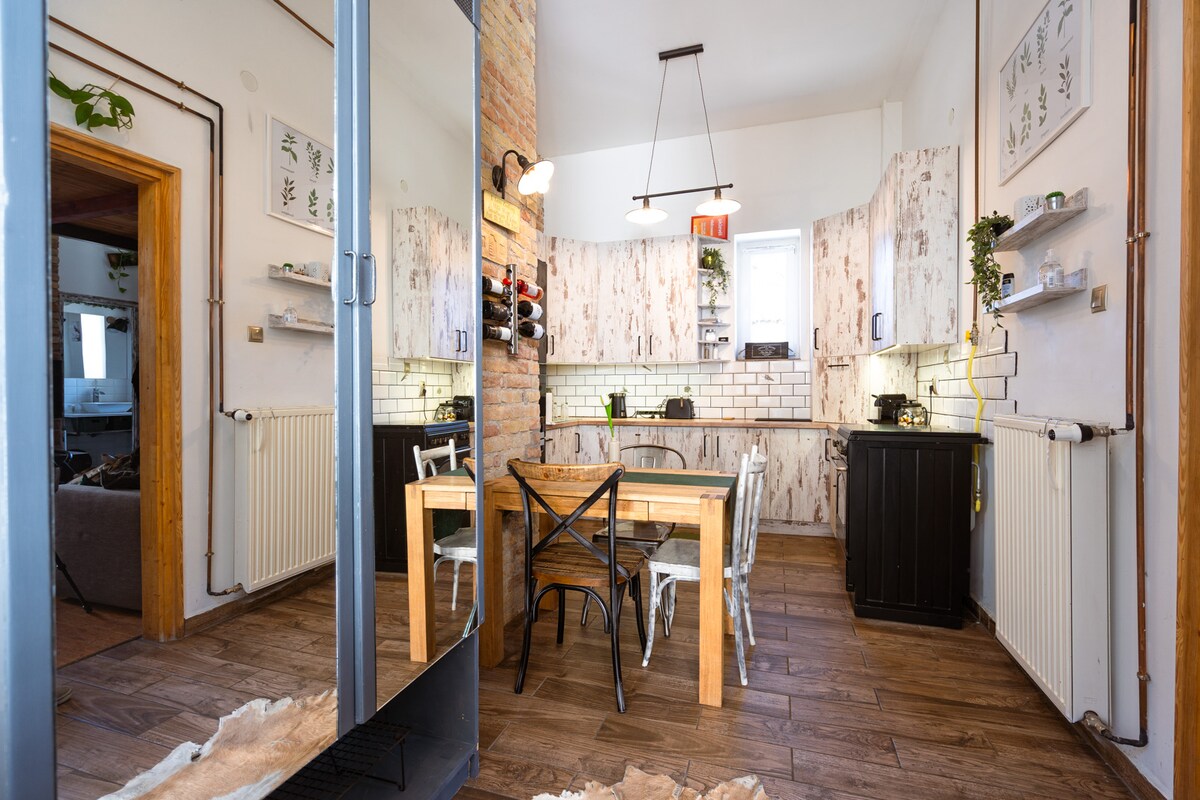 Our 76 sqm flat offers two separate bedrooms (well-spaced for privacy), two bathrooms, a large living room, a fully equipped kitchen with a dining area, and A/C. Filled with natural light, it feels bright and inviting. Located in the historic Palace Quarter 300 meters from Kalvin square (Airport shuttle stop) and the National Museum, this vibrant, up-and-coming area of central Budapest is known for its bohemian charm. Mikszáth Square, with its restaurants, cafés, bars is just a 1 minute walk.