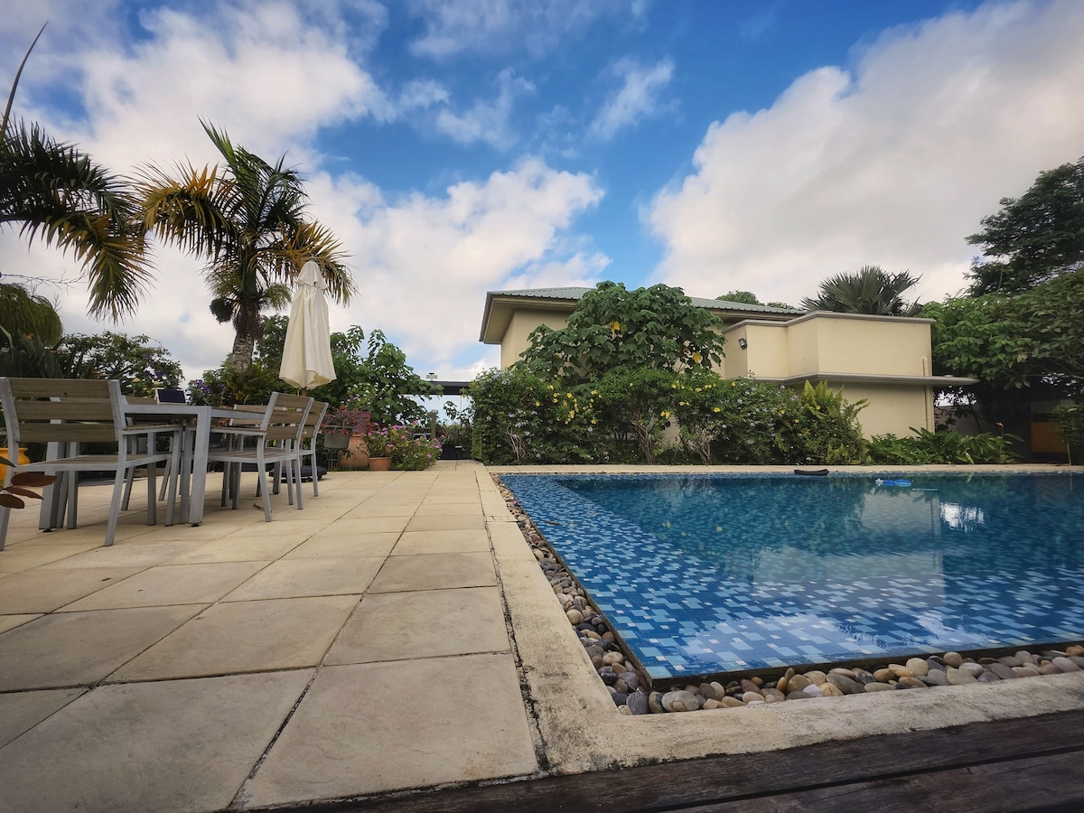 Mavrikinin Bon Espuar şəhərindəki sakit hovuz evimizdə rahatlıq, istirahət və yerli qonaqpərvərliyin ideal kombinasiyasını yaşayın. Sakit Domaine de Bon Espoir-də yerləşən, özünə məxsus villamız altı nəfərə qədər qonaq üçün rahat istirahət təmin edir. Villada üç otaq, əsas yataq otağında isə hamam-tualet var. Gəldikdən sonra sizi əmlakda yaşayan ev sahiblərimiz, Almaniya-Fransa vətəndaşı Martin və Mavritaniya-Fransa vətəndaşı olan Ginette səmimi qarşılayacaq.