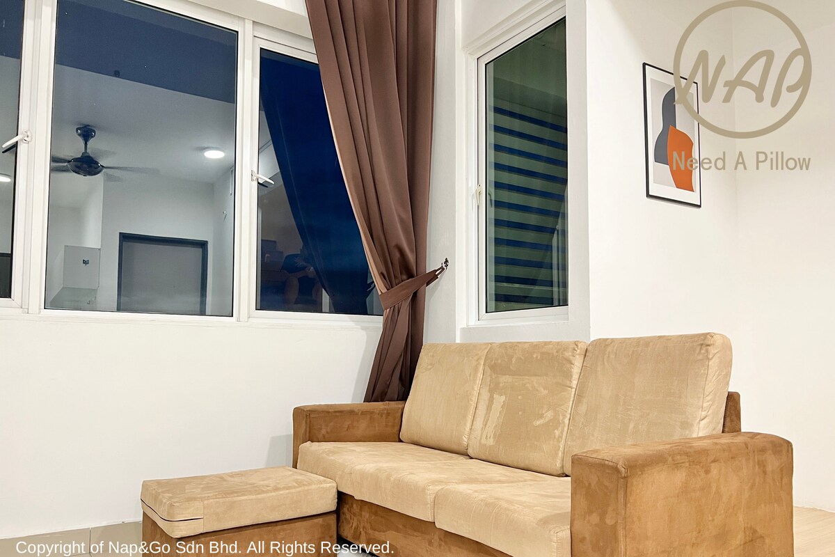 Explore our cozy studio, which can accommodate 2 to 3 people with a queen bed and a sofa bed. Only a 15-minute drive from KLIA T1/T2, the place is surrounded by many restaurants, fast food branches, groceries, and laundry shops, all within walking distance. Savor all the amenities, including the kids’ playground, BBQ area, gym, and swimming pool, with 24/7 security. * Unavailable drop your luggage before check in hours.Due to building designed, need to walk 10 steps staircase to get elevator.