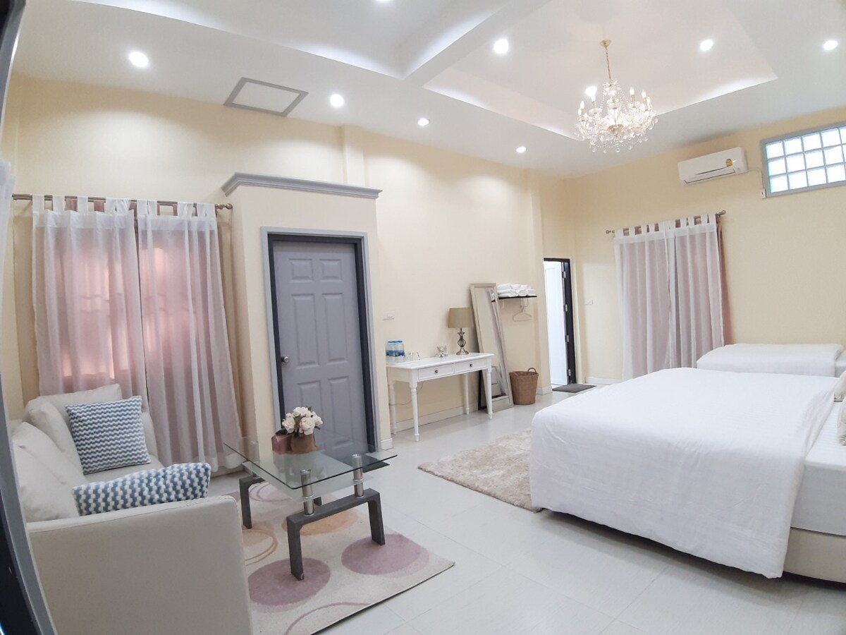 พิมพ์บุญญา เฮ้าส์ - ห้องสำหรับครอบครัวใหญ่ บ้านพักสไตล์อังกฤษ 2ชั้น 3 ห้องนอน 3 ห้องน้ำ โซนห้องนอนชั้นบนตกแต่งแบบห้องใต้หลังคา มี4เตียงเล็ก ชั้นล่าง มี2ห้องนอน ห้องน้ในตัว หอ้งนั่งเล่น และห้องน้ำแยกอีก1ห้อง เหมาะสำหรับการพักผ่อนของครอบครัวใหญ่ รายล้อมด้วยธรรมชาติแสนร่มรื่น สามารถเดินทางไปสถานที่ท่องเที่ยวในจังหวัดอุบลราชธานีได้สะดวก