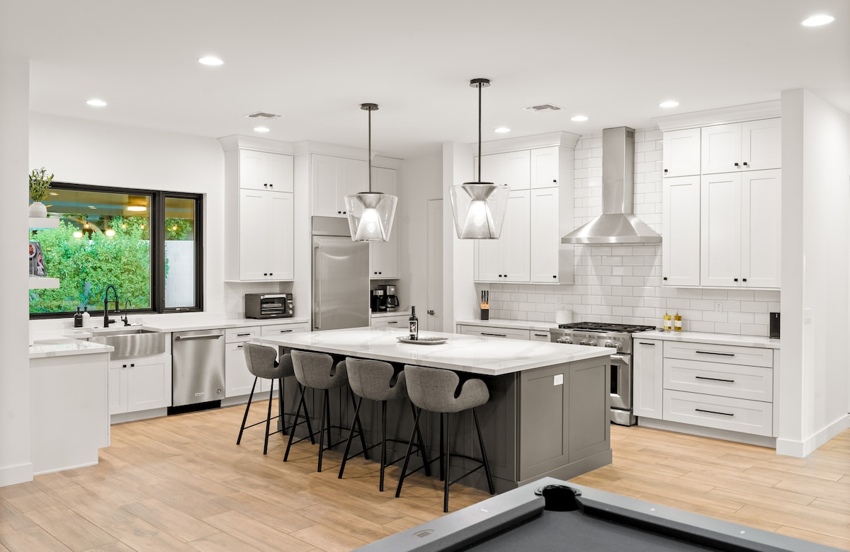 4 En-Suite vanna otağı, 5.5 vanna otağı olan lüks 4 yataq otağı. Ərzaq mağazalarına, restoranlara, barlara və alış-verişə qısa gəzinti. Tamamilə təkmilləşdirilib. Mətbəxdən arxa həyətə qədər uzanan, kommersiya üslublu restoran barına qədər uzanan mükəmməl açıq üzmə sahəsi! Çoxsaylı televizorlar, 2 kegerator və buzlu eynəklər üçün böyük ölçülü dondurucu ilə tam təchiz olunmuş bar. Qızdırılmış Hovuz bir gecə üçün 75 dollardır. Hər şey rahatdır, təmizdir, yenidir və rahatdır! Yeni mebel. Old Town Scottsdale və Camelback Road-a sürətli giriş!