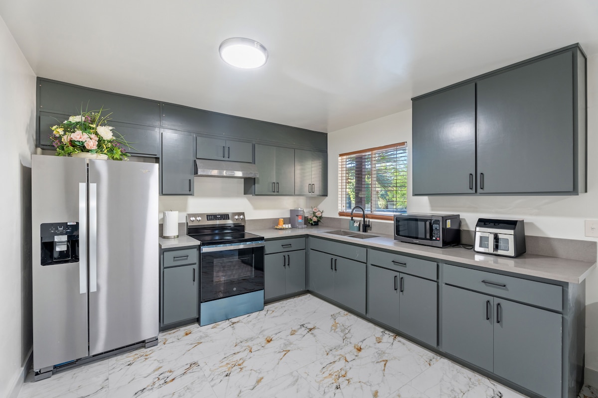 Newly Constructed Private large 3 bedroom unit with modern kitchen which includes stainless steele refrigerator, stove, microwave, dishwasher, dining table for six, kitchen island that seats 4, large main bathroom with walk-in closet and large double sink. The 3 bedrooms have two queen size beds and two twin beds. There's a 75' Samsung TV in the Living Room and a 55" in the main bedroom. Also has a new large washer and dryer. Garage may be shared with the attached Separate 1 Bedroom unit.