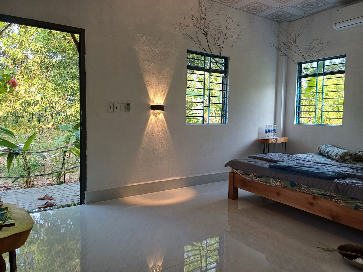 Fevral təbii ağac, yumşaq işıqlandırma və bağ mənzərələri ilə dizayn edilmiş isti və cəlbedici ikinəfərlik otaqdır. Hündür tavanlar, böyük pəncərələr və əl işi detalları parlaq, lakin rahat bir atmosfer yaradır. Bu məkan sakit istirahət axtaran cütlüklər və ya tək səyahətçilər üçün idealdır. Otaqda rahat ikinəfərlik çarpayı, taxta döşəmələr və təbiətdən ilhamlanan düşünülmüş dekorasiya var. Bu, Fuokda qaldığınız müddətdə dincəlmək və rahatlamaq üçün sakit məkan təklif edir.