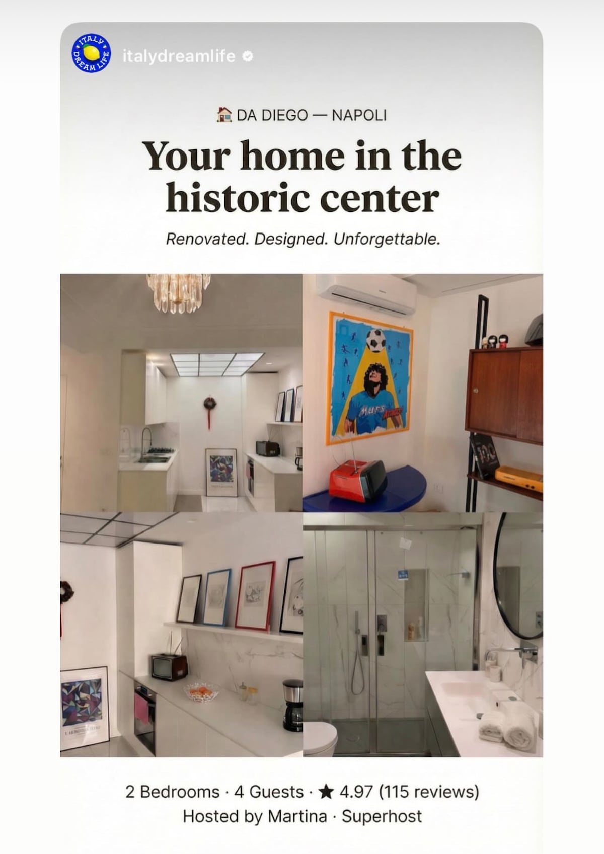 Tarixi, bədii və folklor məkanlarından atılan daş olan qədim Neapolda qonaqlamanın cazibəsi............ "Tarixi Mərkəzin mərkəzində, YUNESKO-nun Ümumdünya İrsi elan etdiyi geniş bədii və memarlıq irsi ilə. Evin strateji mövqeyi üçün ətrafınızdakı bütün məsafəni qət edərək əsl Neapol ilə tanış ola bilərsiniz... "Kafedral, I Dekumani, Neapol metrosu, qədim kilsələr, pizzerialar, sənət adamları və məşhur S. Qreqorio Armeno (nativlik səhnələrinin və çobanların yolu) bir neçə addım uzaqlıqdadır. 600 saylı binanın birinci mərtəbəsində yerləşən otaqlar qonaqlamanı qonaqlarınız üçün rahat və rahat etmək məqsədilə zövq və zərifliklə təmir edilib. Metrolar, hava limanı, qatar stansiyaları, liman və avtomobil yolları asanlıqla əldə edilə bilər. Zərif burgundiya rəngində tamamlanmış bu romantik evdə dörd saata qədər yatır. Fransız divan çarpayısı və tam təchiz olunmuş mətbəxi olan yemək sahəsi olan dadlı və geniş qonaq otağından ibarətdir. Burada ikinəfərlik çarpayı və duşlu vanna otağı olan mezzanin var. Mənzil hər bir komfort, televizor, simsiz əlaqə, müstəqil istilik və kondisioner sistemi ilə təchiz olunub.
